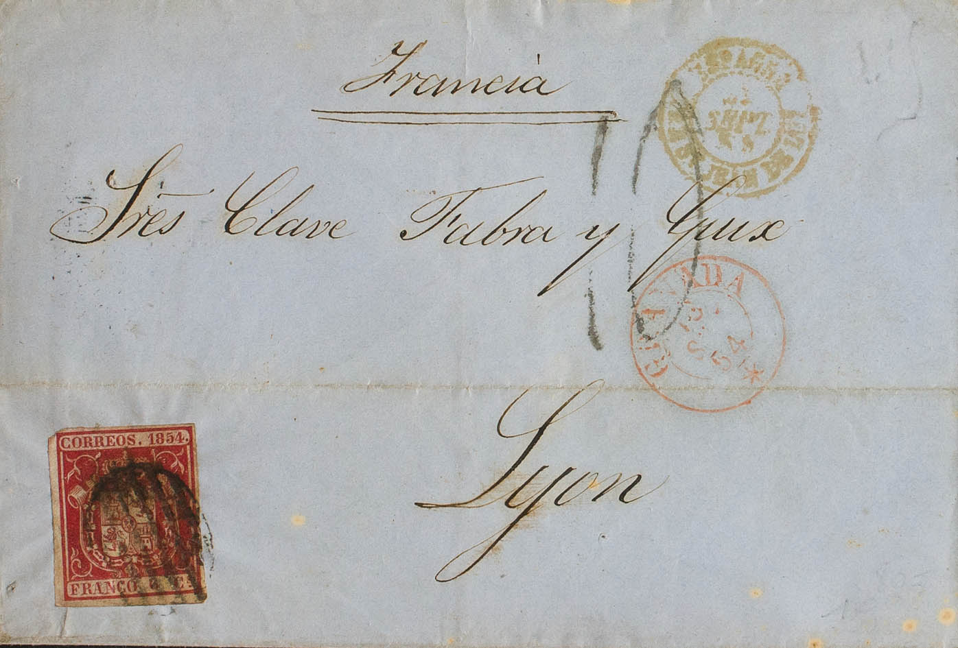 24. 1854. 6 carmine cuartos . GRANADA to LYON (FRANCE). According to the agreement with France in force since January 1850, the postage of ordinary mail to this country was not necessary, assessed with a French postage "10". MAGNIFICENT AND VERY RARE.
