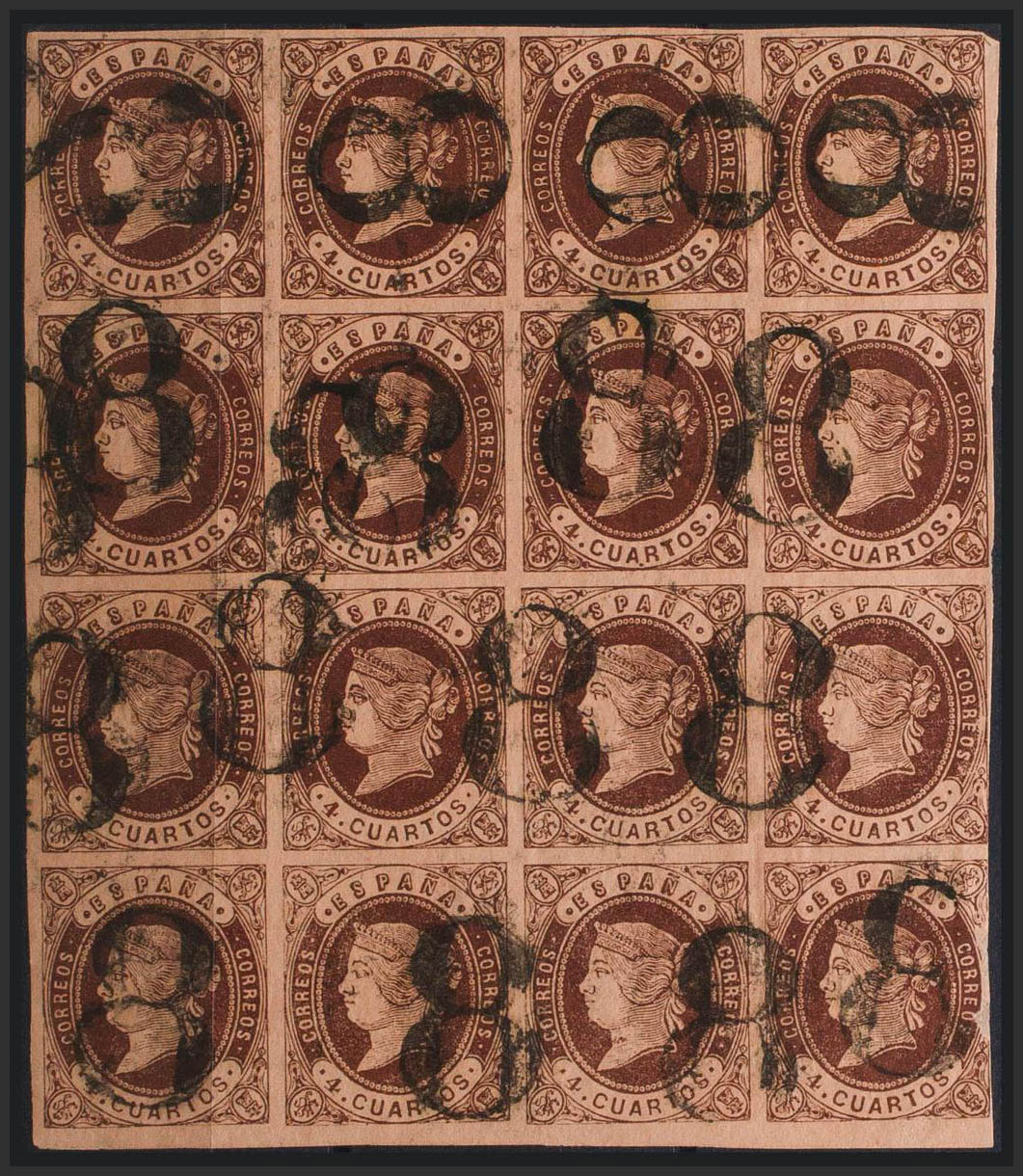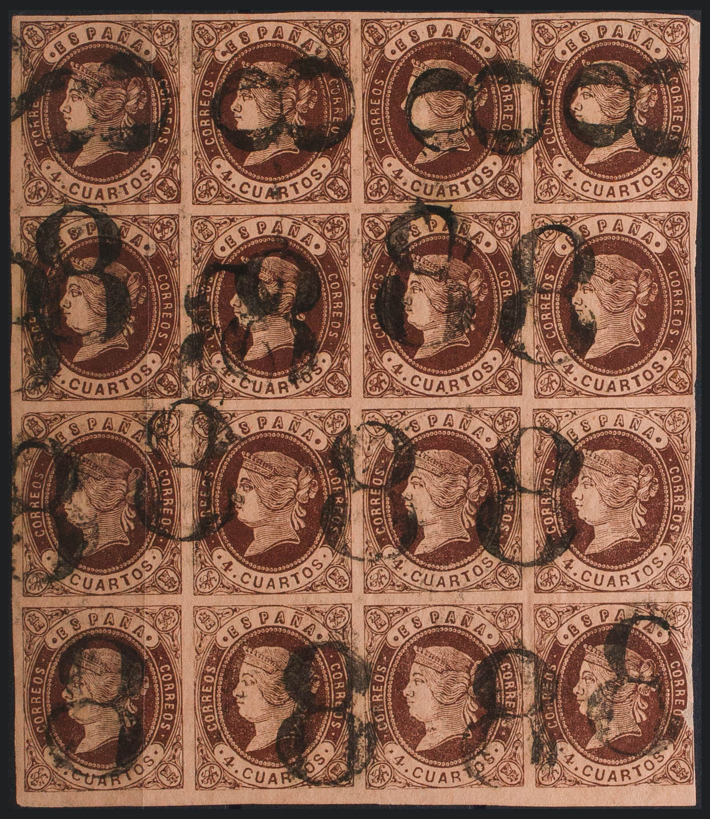 58(16). 1862. 4 chestnut cuartos , block of sixteen. Portage postmark "8", for general use. MAGNIFICENT AND VERY RARE, EVEN MORE IN A BLOCK OF THIS SIZE. Certificate GRAUS.