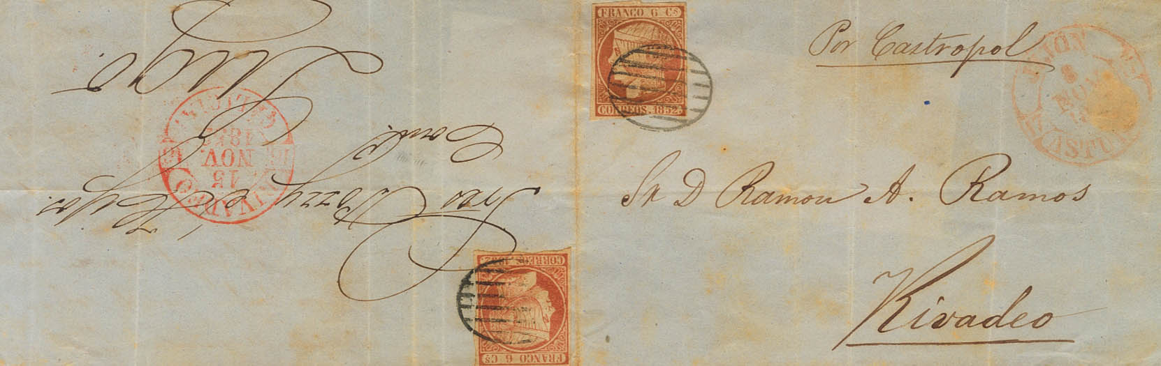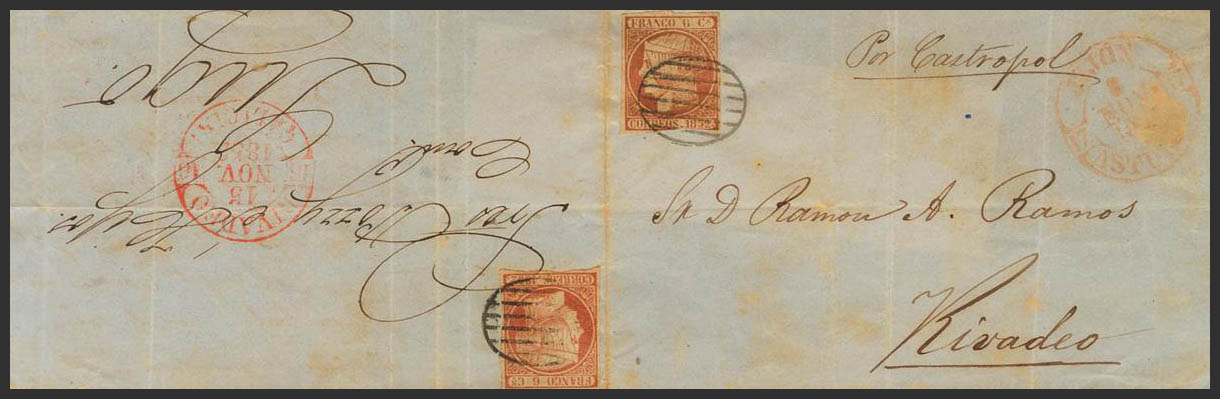 12(2). 1852. Dual-use letter from GIJON to RIVADEO and from RIVADEO to LUGO, franked with a 6- cuartos pink letter in each direction. MAGNIFICENT AND VERY RARE, TRULY SPECTACULAR.