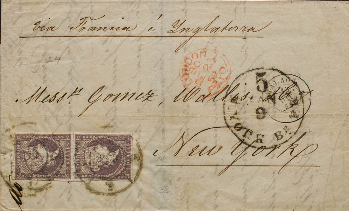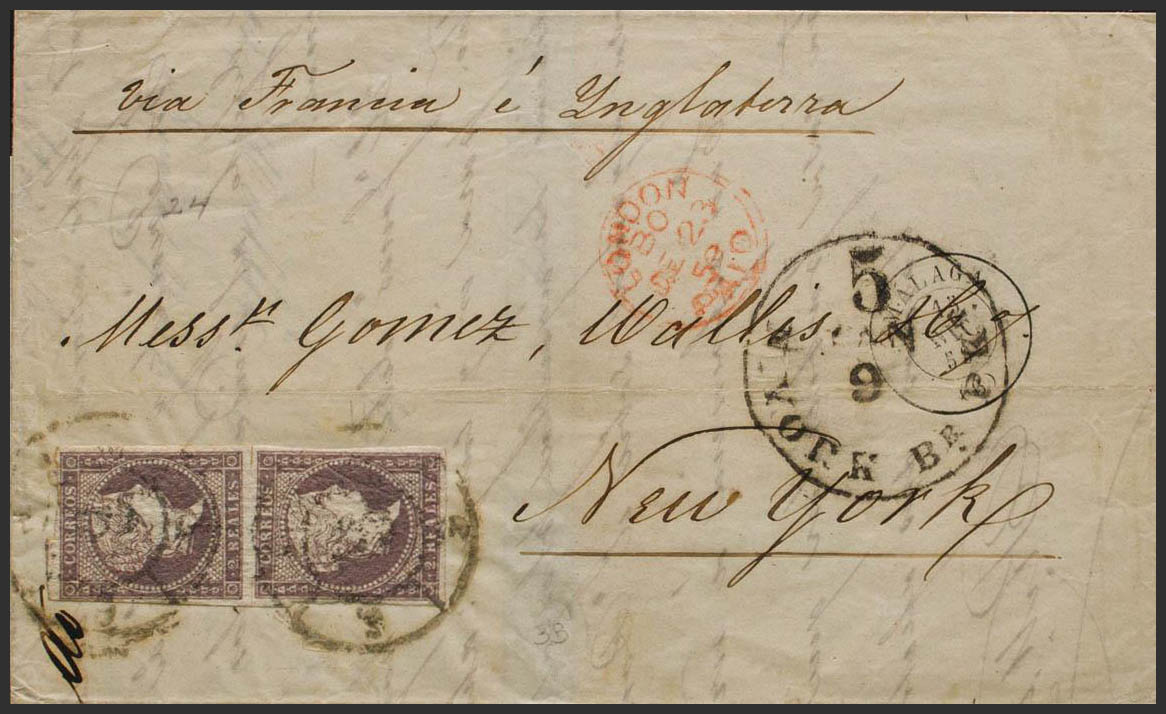 English 46(2). 1859. 2 reales violet, pair. MALAGA to NEW YORK (USA), circulated via France and England. MAGNIFICENT.