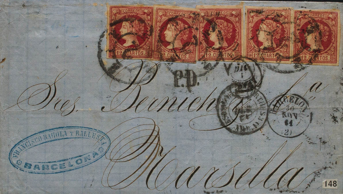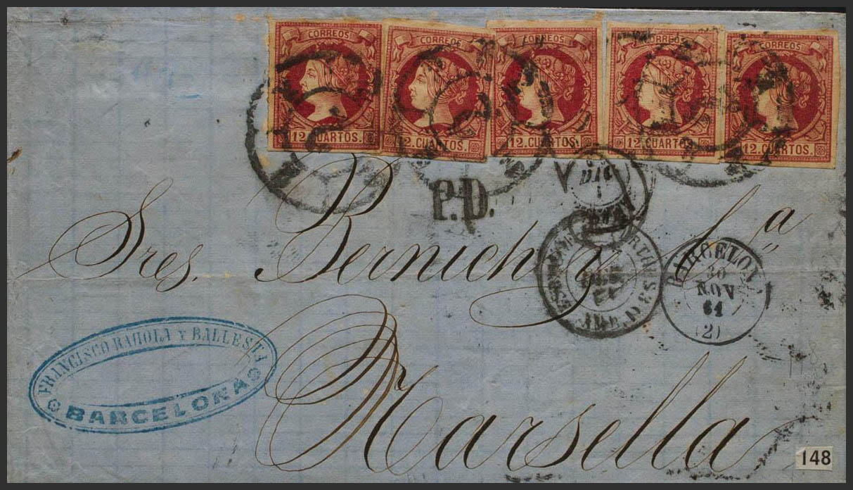 English 53(5). 1861. 12 carmine cuartos , five stamps. BARCELONA to MARSEILLE (FRANCE). MAGNIFICENT AND VERY RARE FIVE POSTAGE POSTAGE TO FRANCE.
