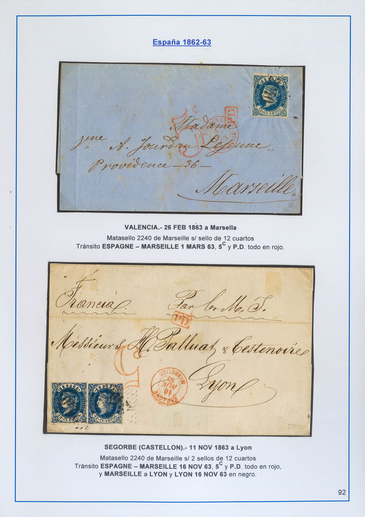 59(3). 1863. Set of two letters, one with a 12- cuartos stamp addressed to MARSEILLE and the other with two 12- cuartos stamps addressed to LYON (FRANCE), both unused with French postmark "2240", from Marseille. MAGNIFICENT.