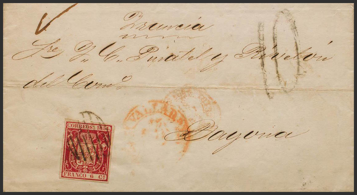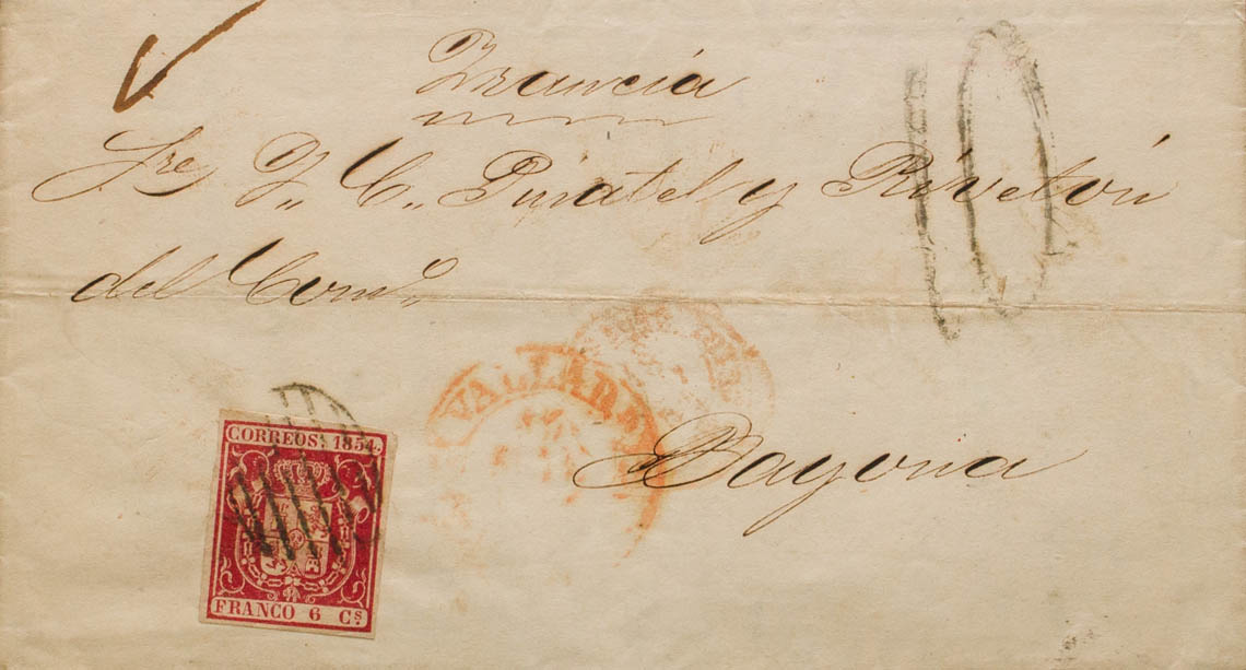 24. 1854. 6 carmine cuartos . VALLADOLID to BAYONNE (FRANCE). Circulated during the Agreement of January 1850 with France, which establishes that prior postage is not necessary for ordinary correspondence, on the front French postage "10" (tenths). MAGNIFICENT AND RARE.
