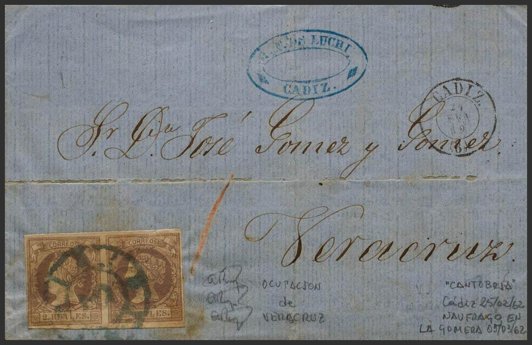 56(2). 1862. 2 lilac reales , pair. CADIZ to VERACRUZ (MEXICO). Transported on the steamer "Cantabria", which at the same time was transporting the troops of the Spanish Expeditionary Army to Veracruz, it so happened that the steamer, from the Antonio López Company, was shipwrecked off the coast of La Gomera (run aground) , the crew, passengers, mail and other merchandise, were picked up by a Russian warship, the Rinde, which transferred them to Santa Cruz de Tenerife, from where they would continue the journey on another ship from Cádiz. MAGNIFICENT AND EXTRAORDINARILY RARE DIRECTED TO MEXICO DURING THE PERIOD OF OCCUPATION OF VERACRUZ BY FRANCO-SPANISH TROOPS WITH GENERAL PRIM AT THE HEAD, ONLY THREE KNOWN.