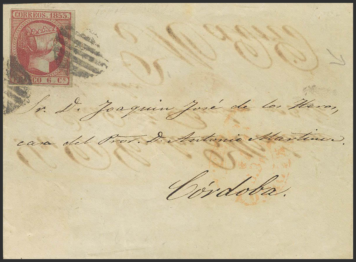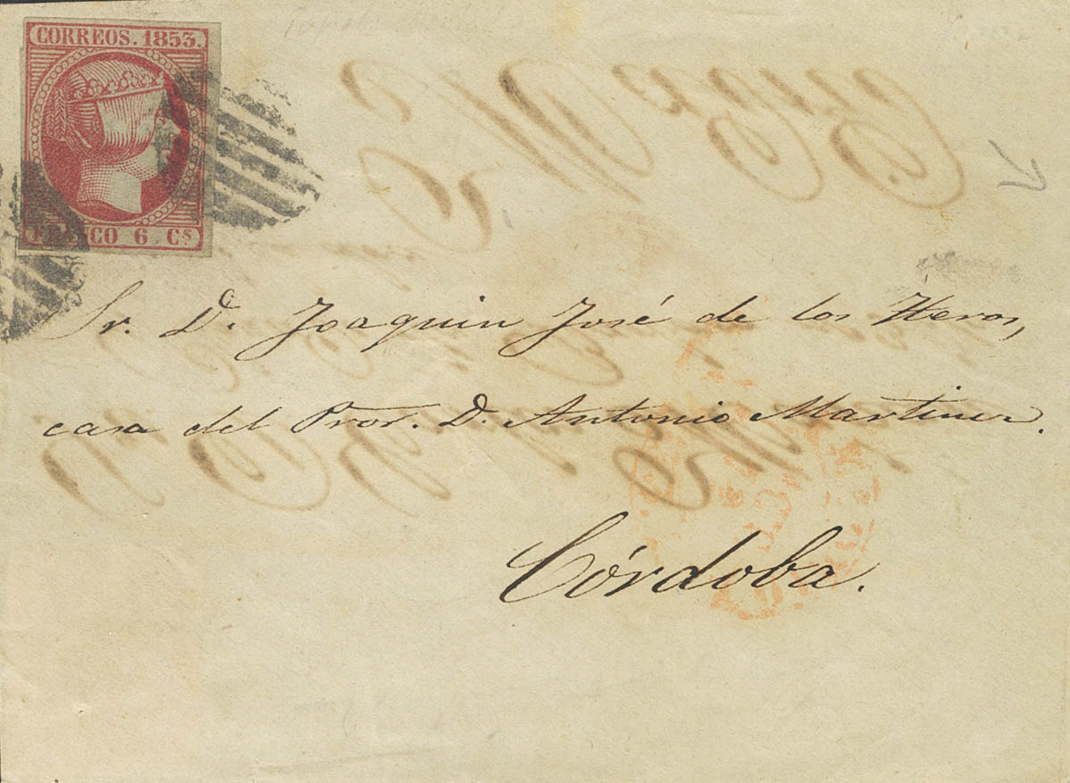 English 17 pa. 1853. 6 cuartos carmine BLUE PAPER. Front addressed to CORDOBA and the return from MADRID to CORDOBA, franked with the 6 cuartos carmine with white paper. MAGNIFICENT AND RARE. cert. EMF.
