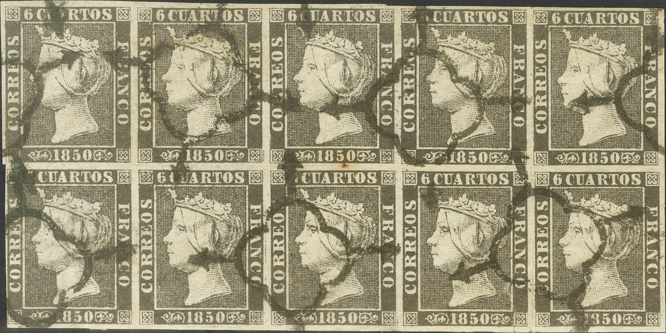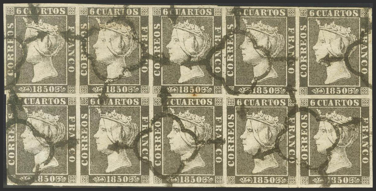 1A(10). 1850. 6 cuartos black, block of ten (some common defects in large blocks). SPIDER postmark. MAGNIFICENT AND VERY RARE, PIECE OF ENORMOUS SPECTACULARITY. Cert. EMF.