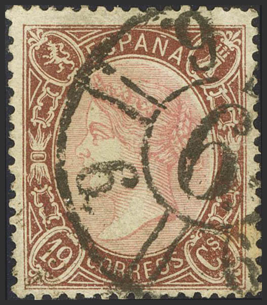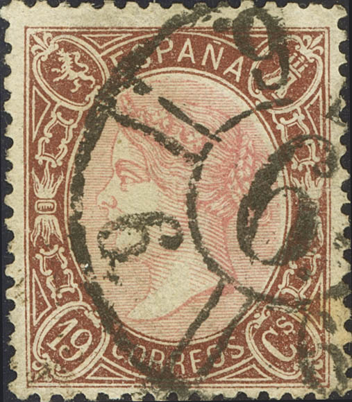 77. 1865. 19 pink and brown cuartos . Exceptional centering and very intense color. LUXURY PIECE, WE ARE WITHOUT A DOUBT ONE OF THE MOST BEAUTIFUL USED COPIES KNOWN, WITH ORIGINAL TEETH AND WITHOUT RETOUCHING. Cert. COMEX.