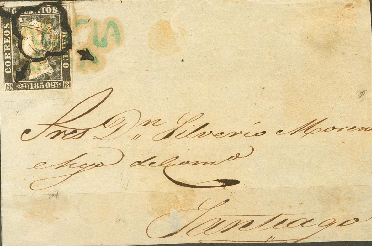 |ENVELOPE| 1A. 1850. 6 black quarters. Front from NOYA to SANTIAGO. Mixed postmark GALICIA / NOYA, in blue and SPIDER. RARE AND BEAUTIFUL.