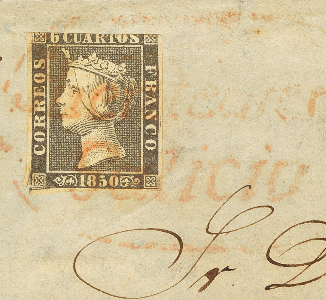 △ 1A. 1850. 6 cuartos black (II-29), on fragment. Pre-philatelic postmark PUENTEAREAS / GALICIA, in red. MAGNIFICENT AND RARE. Certificate GRAUS.