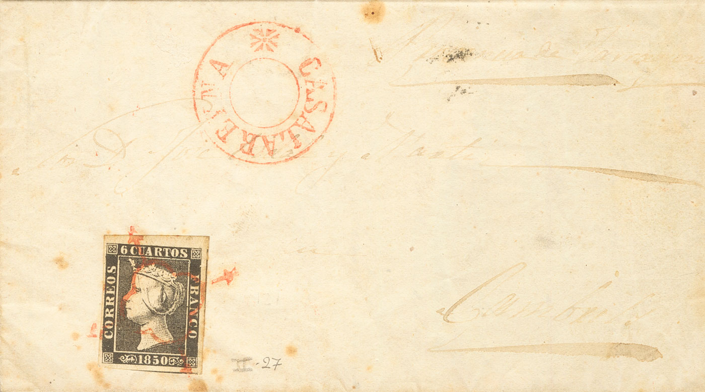 English 1. 1850. 6 cuartos black. CASALARREINA (LA RIOJA) to CAMBRILS (TARRAGONA). ARAÑA postmark, in red, on the front pre-philatelic mark CASALAREYNA, in red. MAGNIFICENT AND EXTRAORDINARILY RARE.