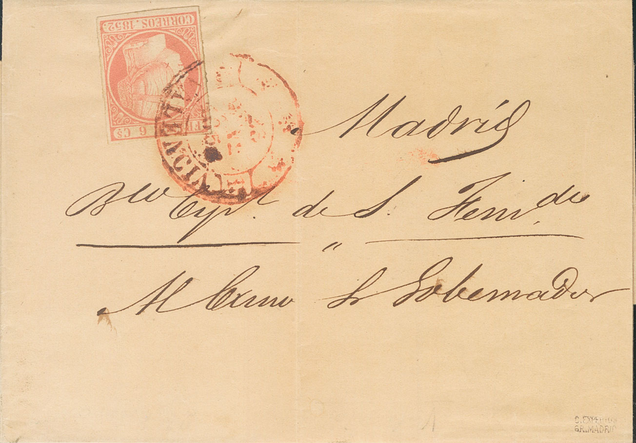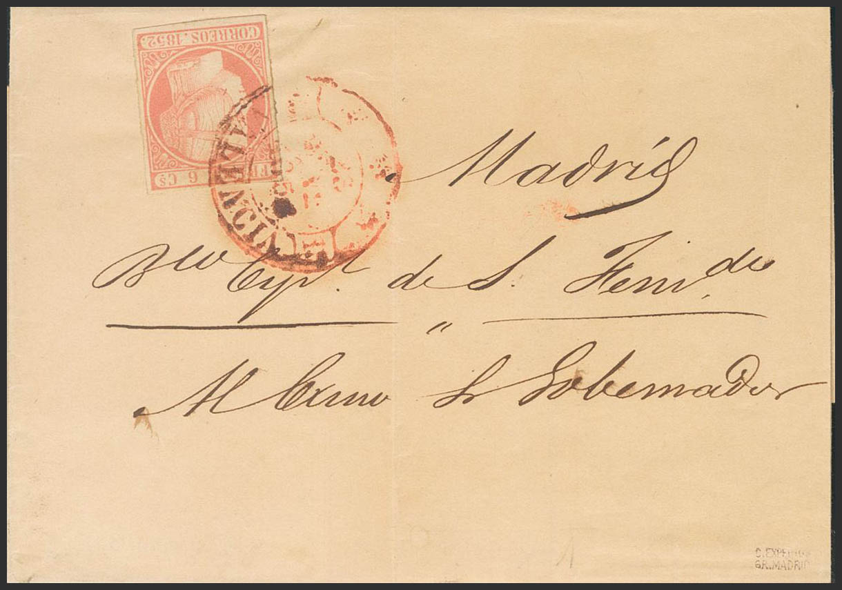 12. 1852. 6 cuartos pink. VALENCIA to MADRID. Postmark baeza *** / VALENCIA, in red. MAGNIFICENT AND EXTREMELY RARE, ESPECIALLY WITH THIS SPECTACULAR STAMPING, POSSIBLY UNIQUE KNOWN.