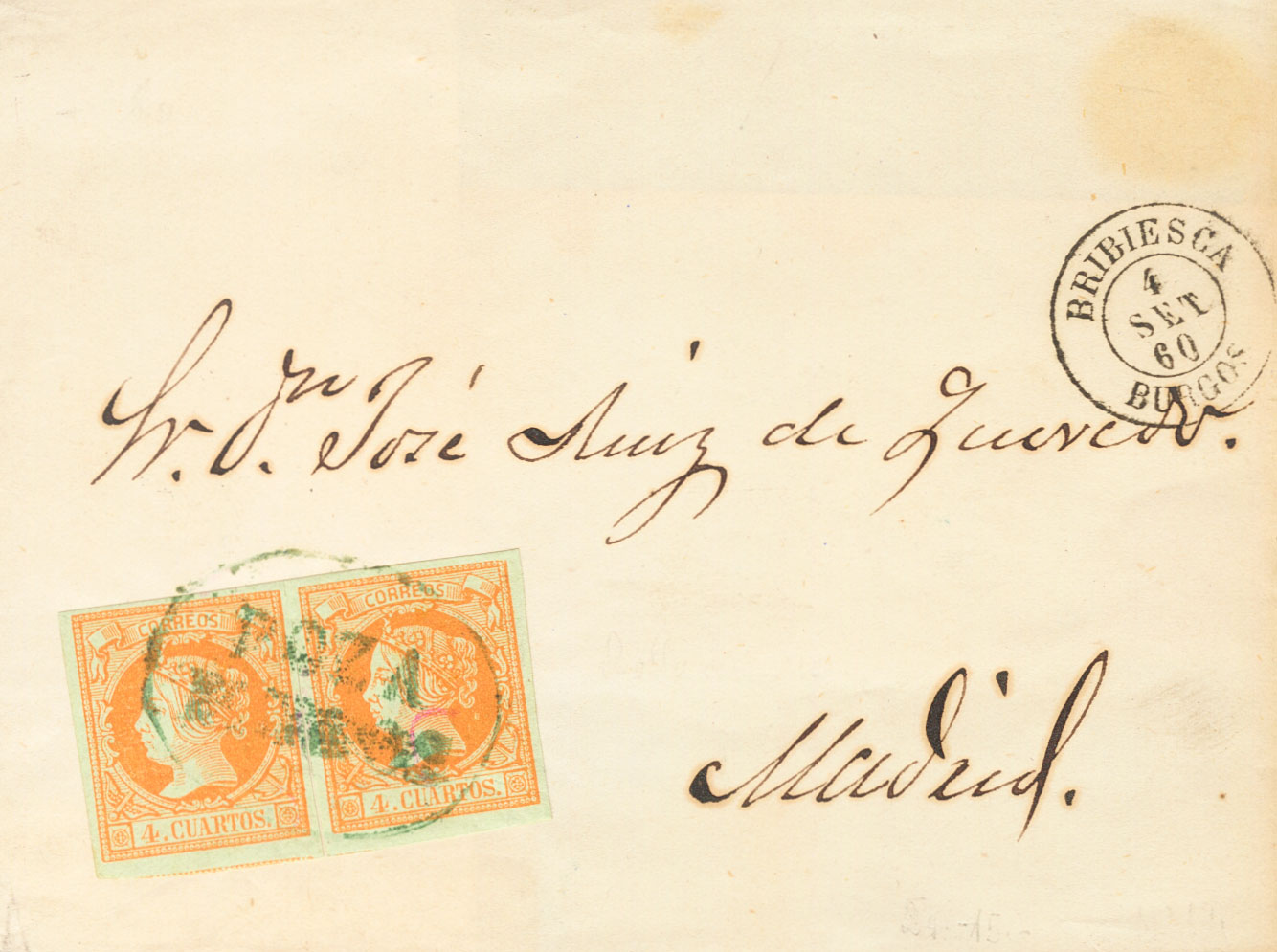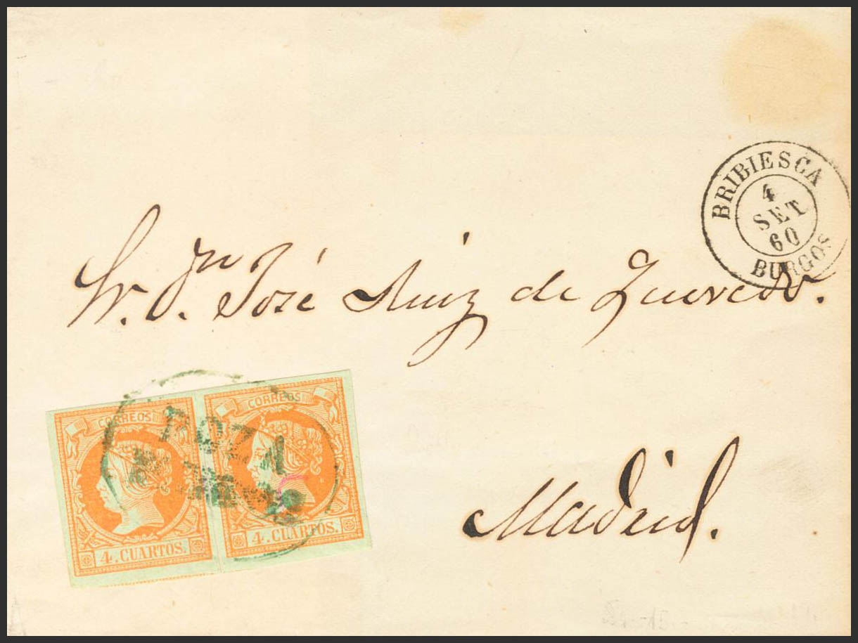 52(2). 1860. 4 cuartos orange, pair. POZA DE LA SALT to MADRID. Pre-philatelic postmark POZA / BURGOS, in blue. MAGNIFICENT AND EXTRAORDINARILY RARE.