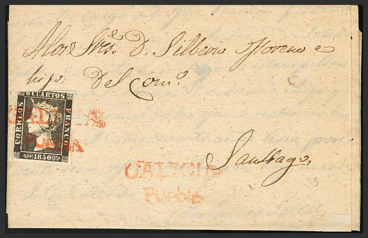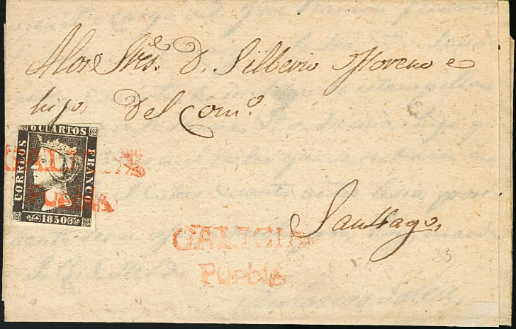 1A. 1850. 6- cuartos black. PUEBLA to SANTIAGO. Pre-philatelic postmark GALICIA / PUEBLA, in red. MAGNIFICENT AND RARE.