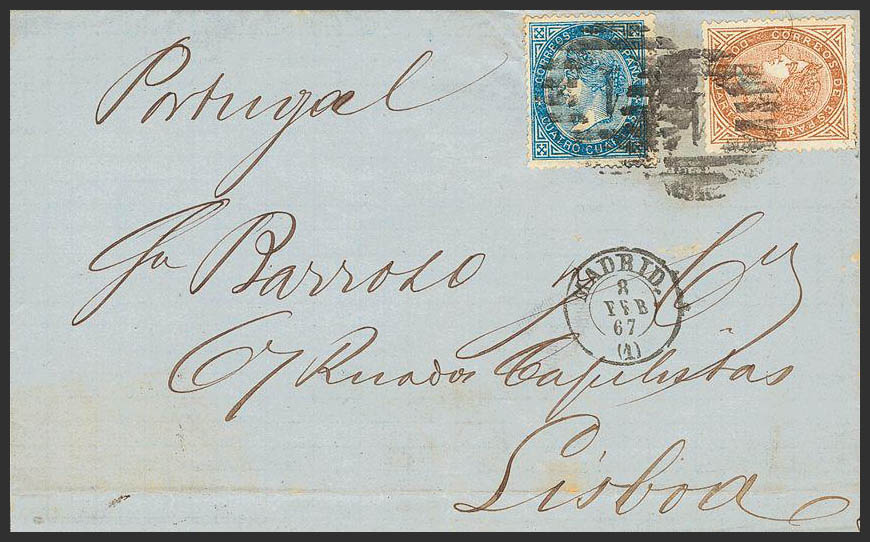 English 87, 88. 1867. 2 cuartos chestnut and 4 cuartos blue. MADRID to LISBON. Postmark GRILL WITH Nº 1. RARE DESTINATION IN THIS ISSUE.