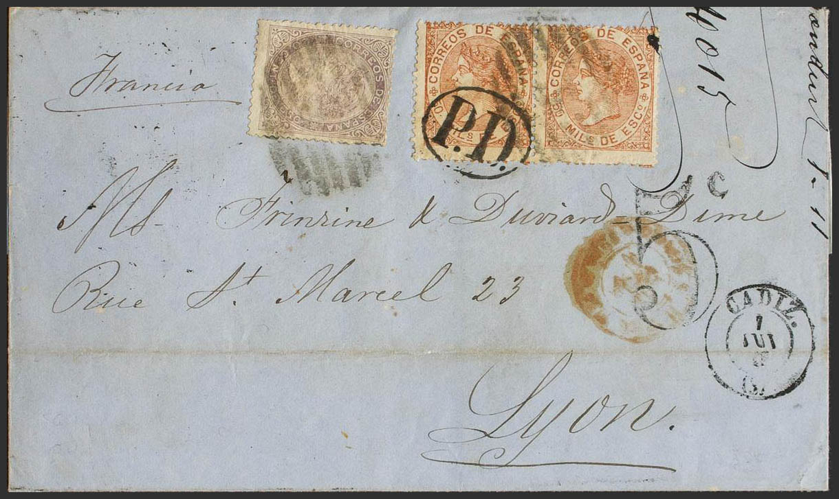 92, 96(2). 1868. Lilac 20 cts and light chestnut 50 cts, two stamps. CADIZ to LYON (FRANCE). MAGNIFICENT AND VERY RARE COMBINATION OF POSTAGE TO COMPLETE THE RATE OF DOUBLE POSTAGE TO FRANCE WITH EXCESS OF ½ QUARTER.
