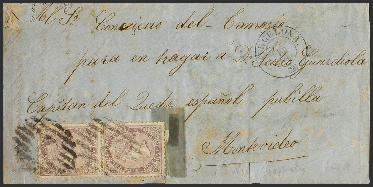 92(2). 1867. 20 cts lilac, pair. BARCELONA to MONTEVIDEO (URUGUAY) (some defect on the envelope). Circulated by the Portuguese route but franked as if it were by the English route, so there are 5 cuartos left over. BEAUTIFUL AND RARE.