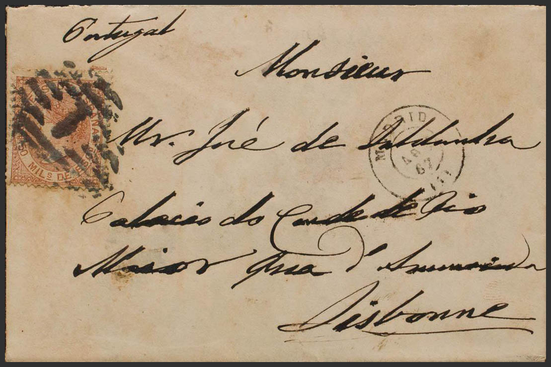 English 96. 1867. 50 mils light chestnut. MADRID to LISBON (PORTUGAL). MAGNIFICENT AND RARE.