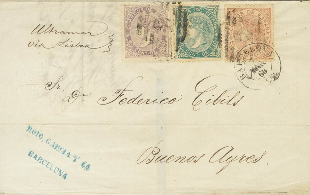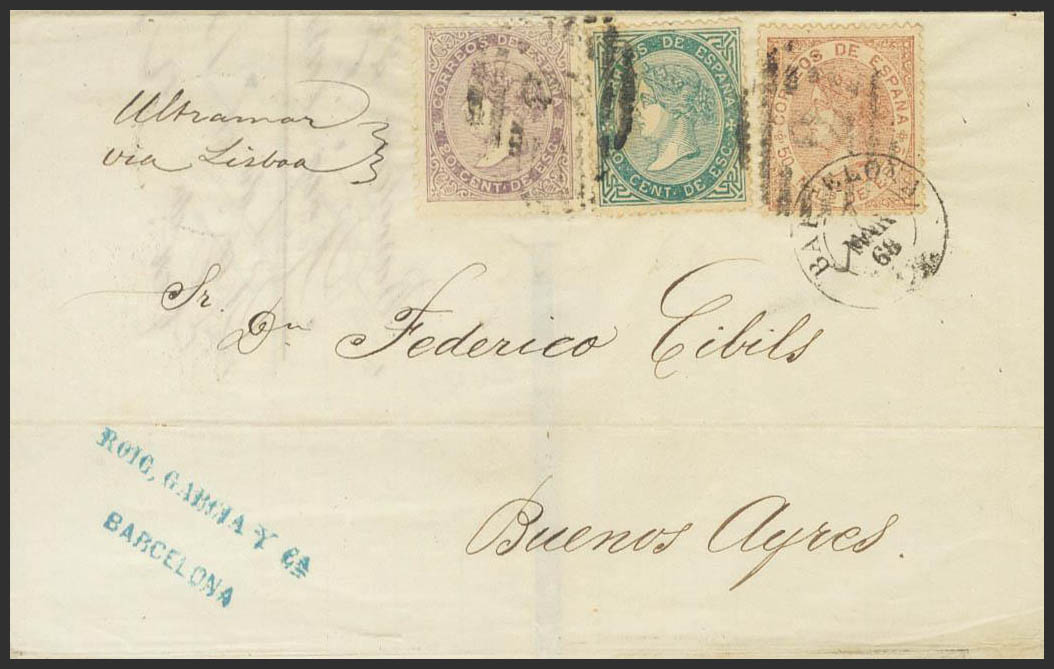 91, 92, 96. 1868. 10 cts green, 20 cts lilac and 50 cts yellow chestnut. BARCELONA to BUENOS AIRES (ARGENTINA), on the front manuscript "Oltramar via Lisbon". MAGNIFICENT AND VERY RARE COMBINATION OF POSTAGE TO COMPLETE THE RATE OF 350 MILS TO ARGENTINA VIA PORTUGAL.
