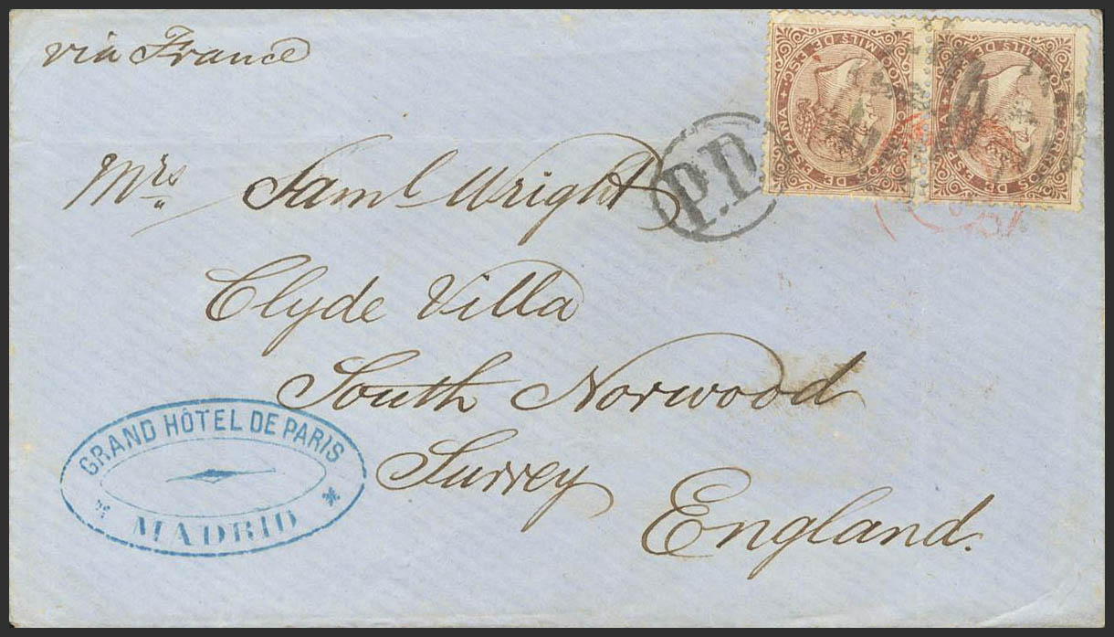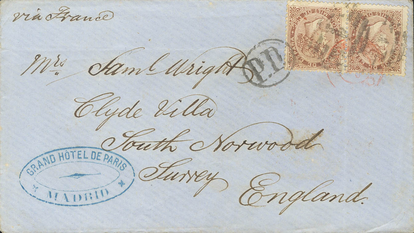 English 99(2). 1869. 100 mils chestnut. MADRID to SURREY (ENGLAND). MAGNIFICENT AND RARE COMBINATION TO COMPLETE THE 200 MILS FEE TO ENGLAND.