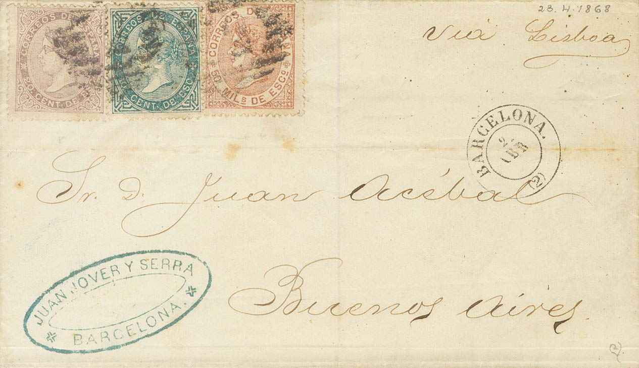 English 91, 92, 96. 1868. 10 cts green, 20 cts lilac and 50 mils yellow chestnut. BARCELONA to BUENOS AIRES (ARGENTINA). MAGNIFICENT AND VERY RARE COMBINATION OF POSTAGE TO COMPLETE THE RATE OF 350 MILS TO PORTUGAL.