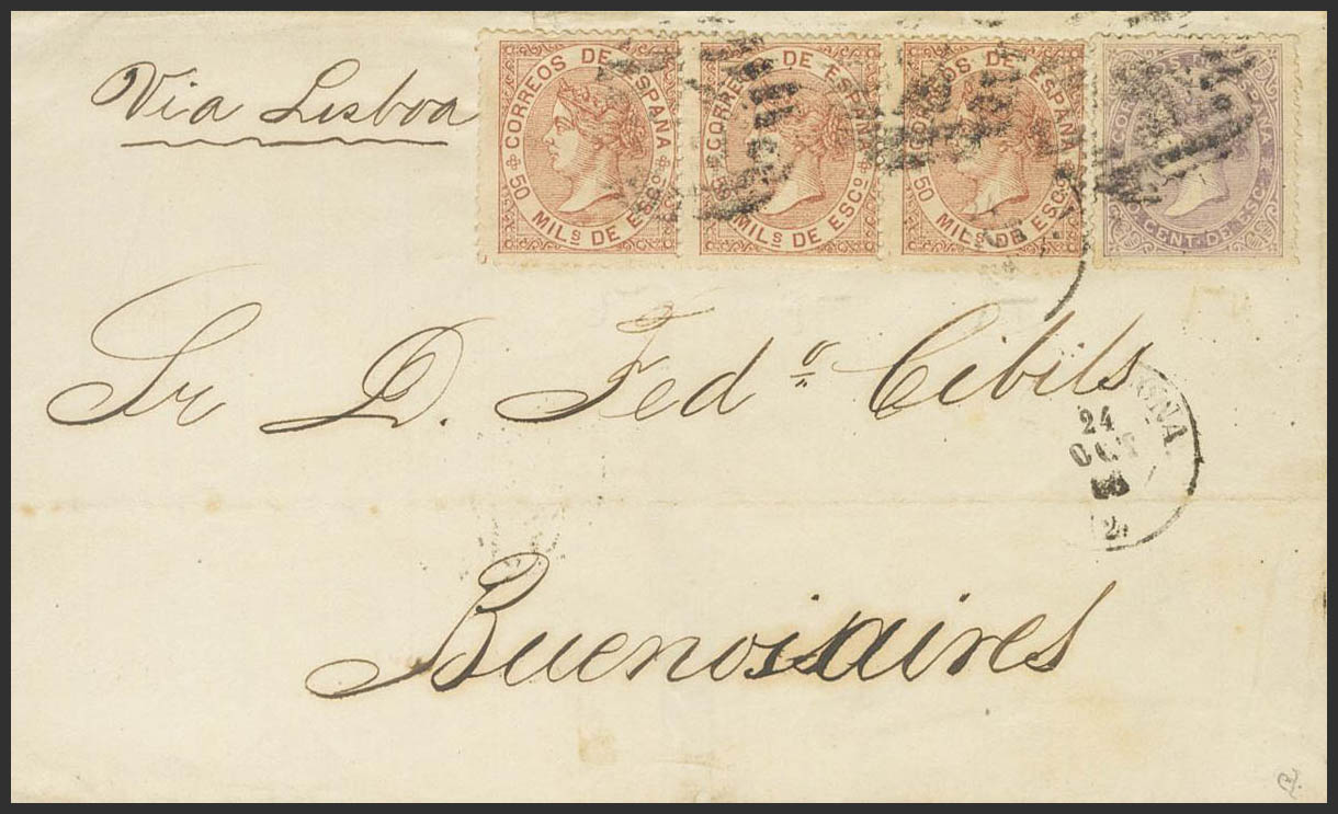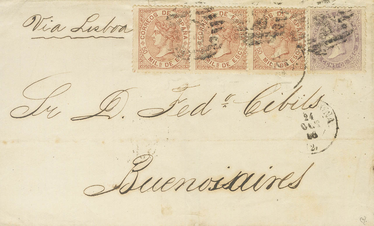 92, 96(3). 1868. 20 cts lilac and 50 mils chestnut yellow, three stamps. BARCELONA to BUENOS AIRES (ARGENTINA). MAGNIFICENT AND VERY RARE COMBINATION OF POSTAGE TO COMPLETE THE RATE OF 350 MILS TO PORTUGAL.