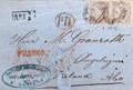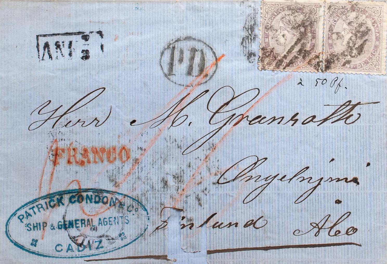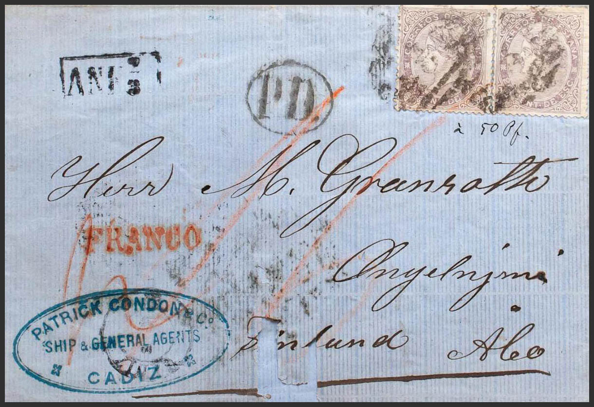 92(2). 1868. 20 cts lilac, two stamps. CADIZ to ABO (FINLAND) (unimportant erosions on the front). On the front it marks FRANCO, in red applied in transit through PRUSIA and a handwritten notation "at 50 pf". MAGNIFICENT AND EXTRAORDINARY RARE DESTINATION, IT IS VERY PROBABLY THE OLDEST LETTER ADDRESSED TO FINLAND WITH POSTAGE OF 34 QUARTERS ACCORDING TO THE RATE TO RUSSIA (32 QUARTERS) FROM JANUARY 1866.