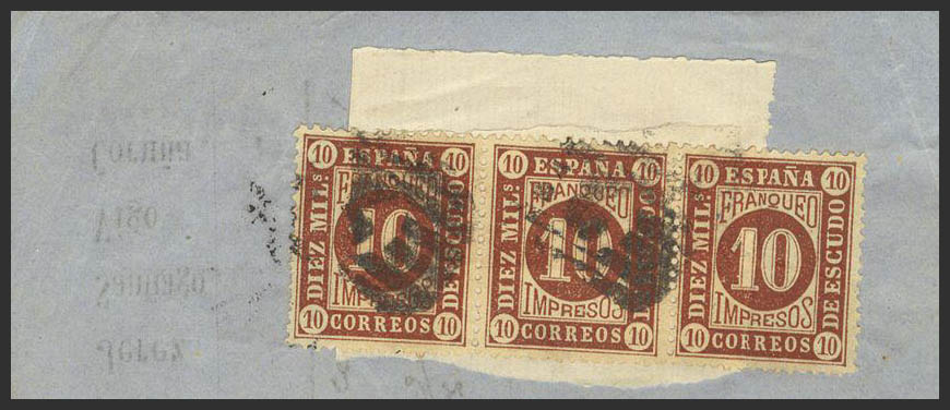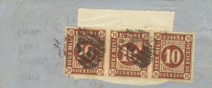 △ 94(3). 1867. 10 cts brown, strip of three, on newspaper band. MAGNIFICENT AND RARE. Edifil 2009: +105 Euros