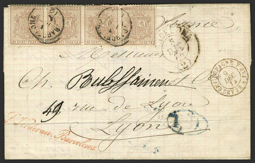 153(4). 1874. 10 chestnut cts, strip of four. BARCELONA to LYON (FRANCE). MAGNIFICENT.
