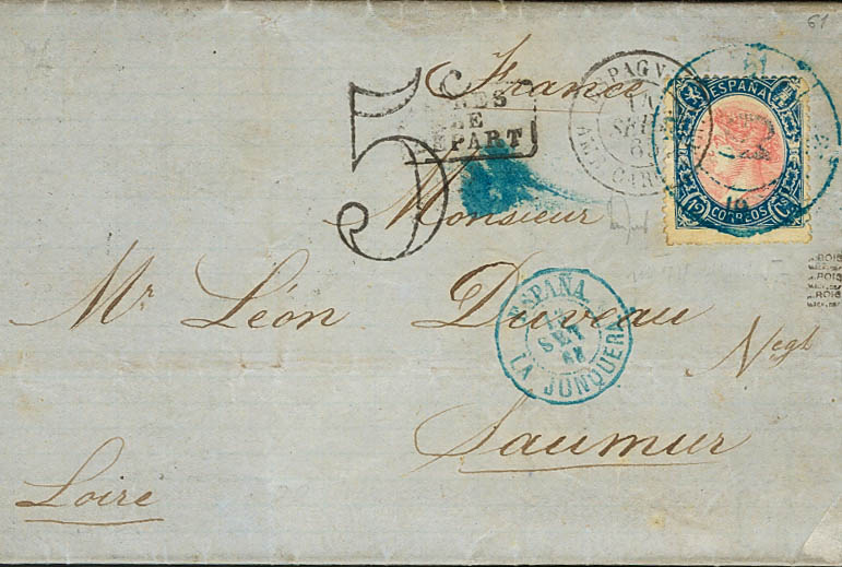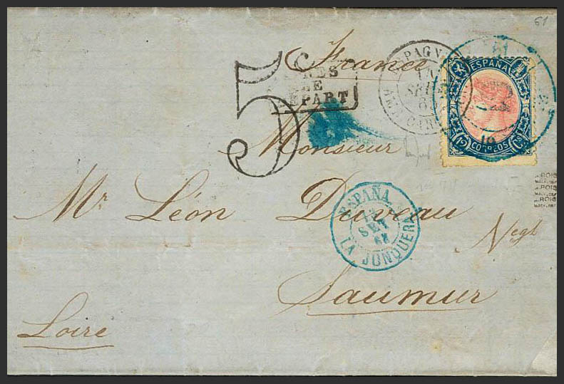 76. 1865. 12 blue and pink cuartos . DARNIUS to SAUMUR (FRANCE). Postmark R.CARRETA Nº61, in blue, from La Junquera, on the front several French brands. MAGNIFICENT AND VERY RARE.