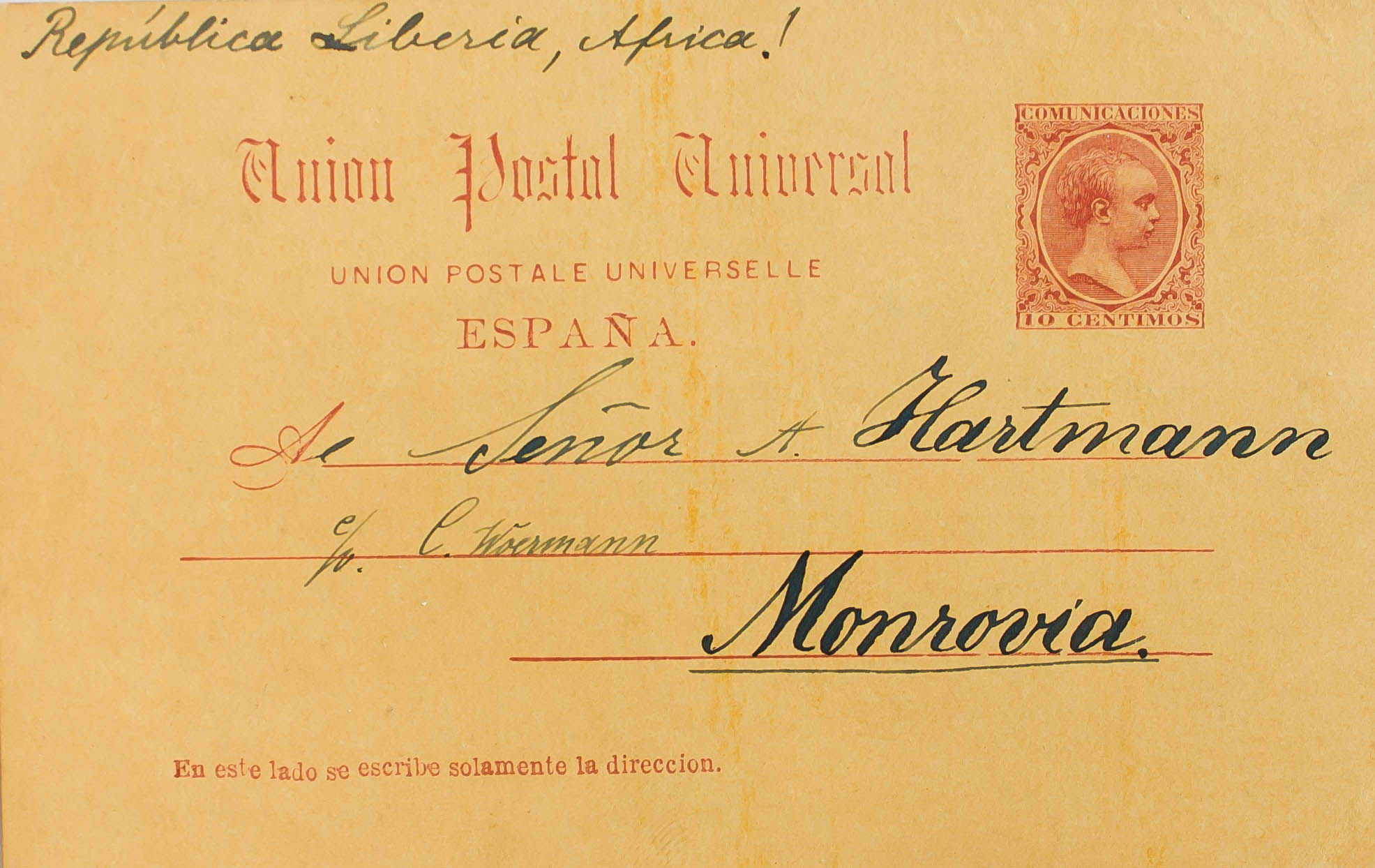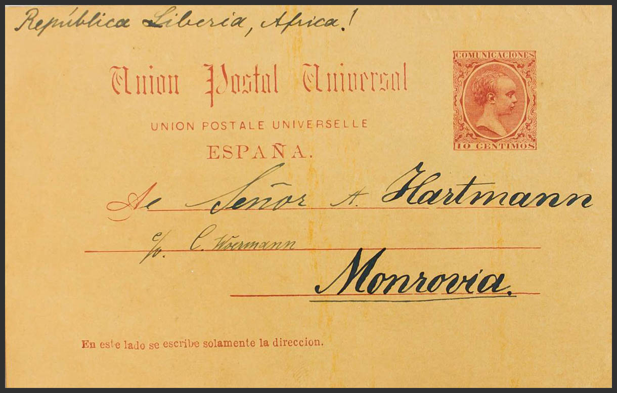EP21. 1890. 10 cts carmine on Entire Post Card from SANTA CRUZ DE TENERIFE to MONROVIA (LIBERIA) (circulated without postmarks). On the back handwritten annotation "Deutsches Consulat, Madeira" and "blue crosses". MAGNIFICENT AND RARE DESTINATION.