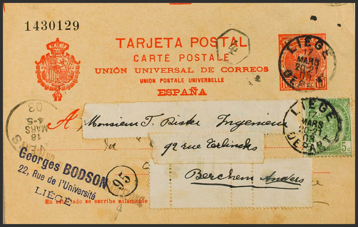 EP42. 1903. 10 cts orange on Entire Post Card from BARCELONA to LIEJA (BELGIUM), and forwarded to ANTWERP. Postmark LIEGE / DEPART, applied at destination, where it is franked with a 5 ct Belgian green stamp and the new address is added on the edges of the sheet adhered to the old address. MAGNIFICENT AND VERY RARE MIXED POSTAGE.
