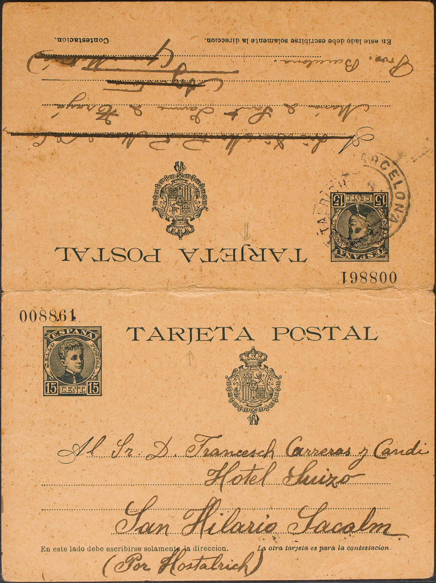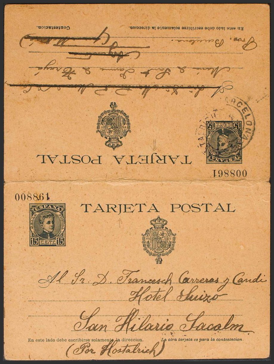 EP38. 1905. 15 cts + 15 cts slate envelope Entire Card Round-trip postcard from SAN HILARIO to ARGENTONA and back to SAN HILARIO. MAGNIFICENT.