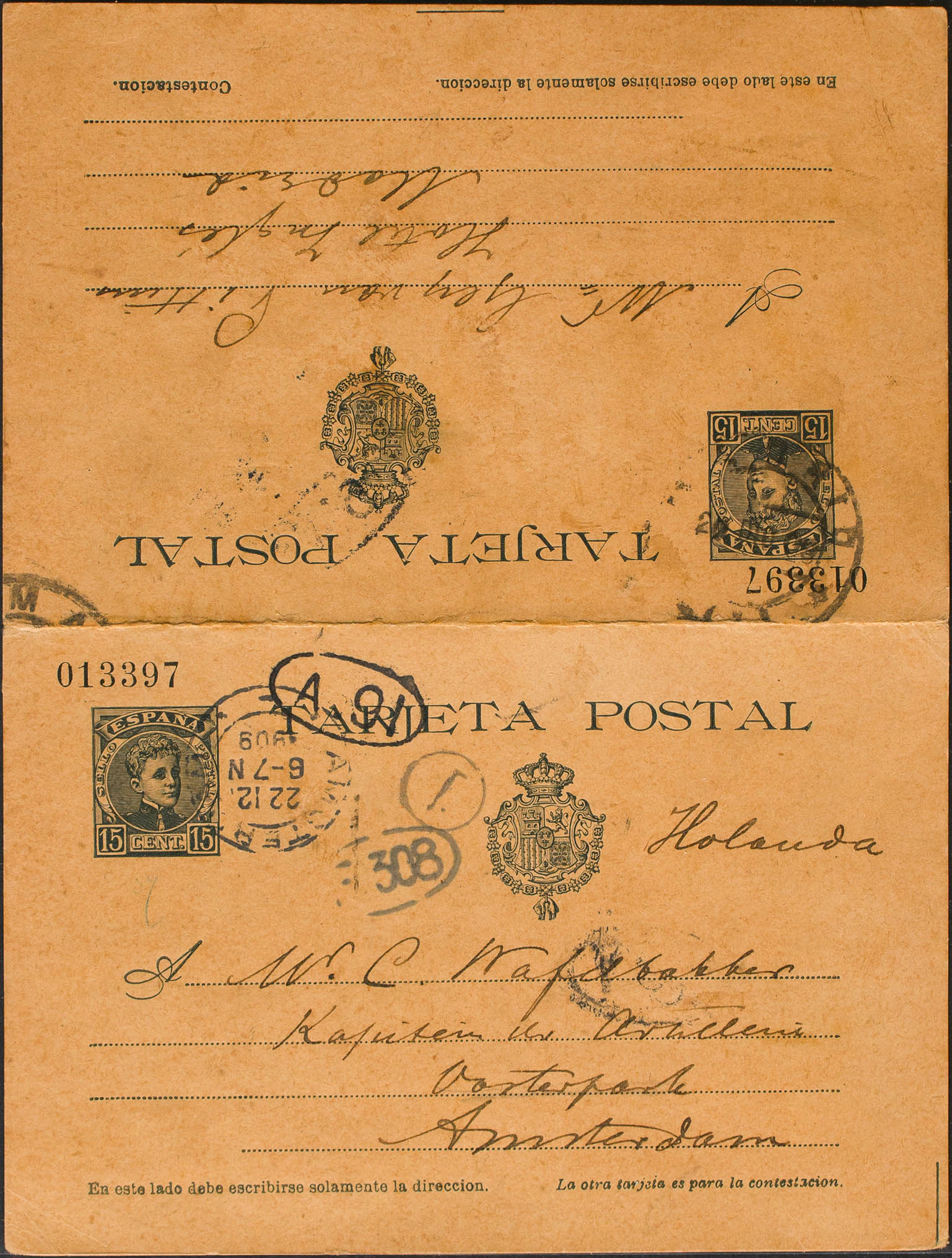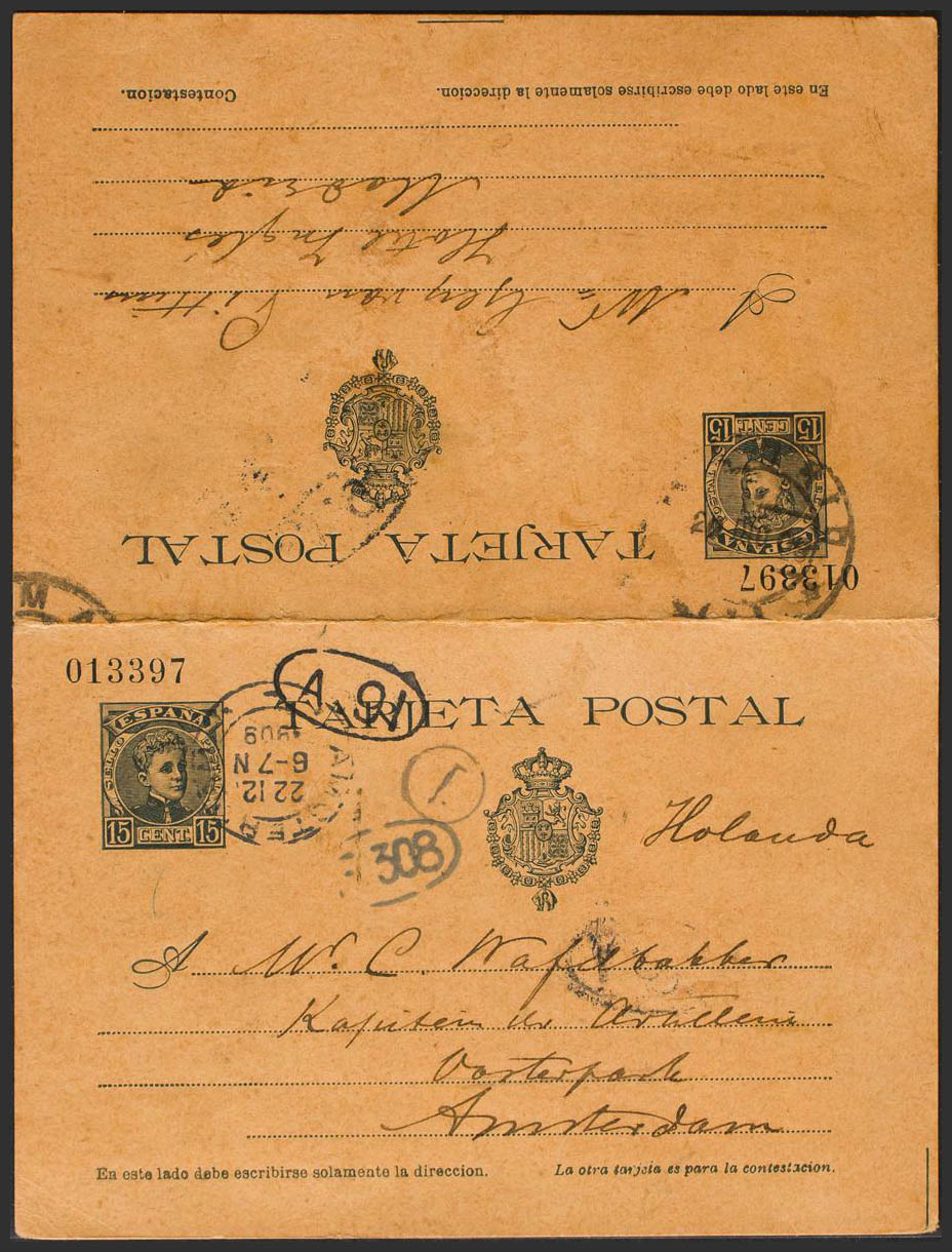 EP38. 1909. 15 cts + 15 cts slate envelope Entire Card Round-trip postcard from MADRID to AMSTERDAM (HOLLAND) and back to MADRID. MAGNIFICENT.