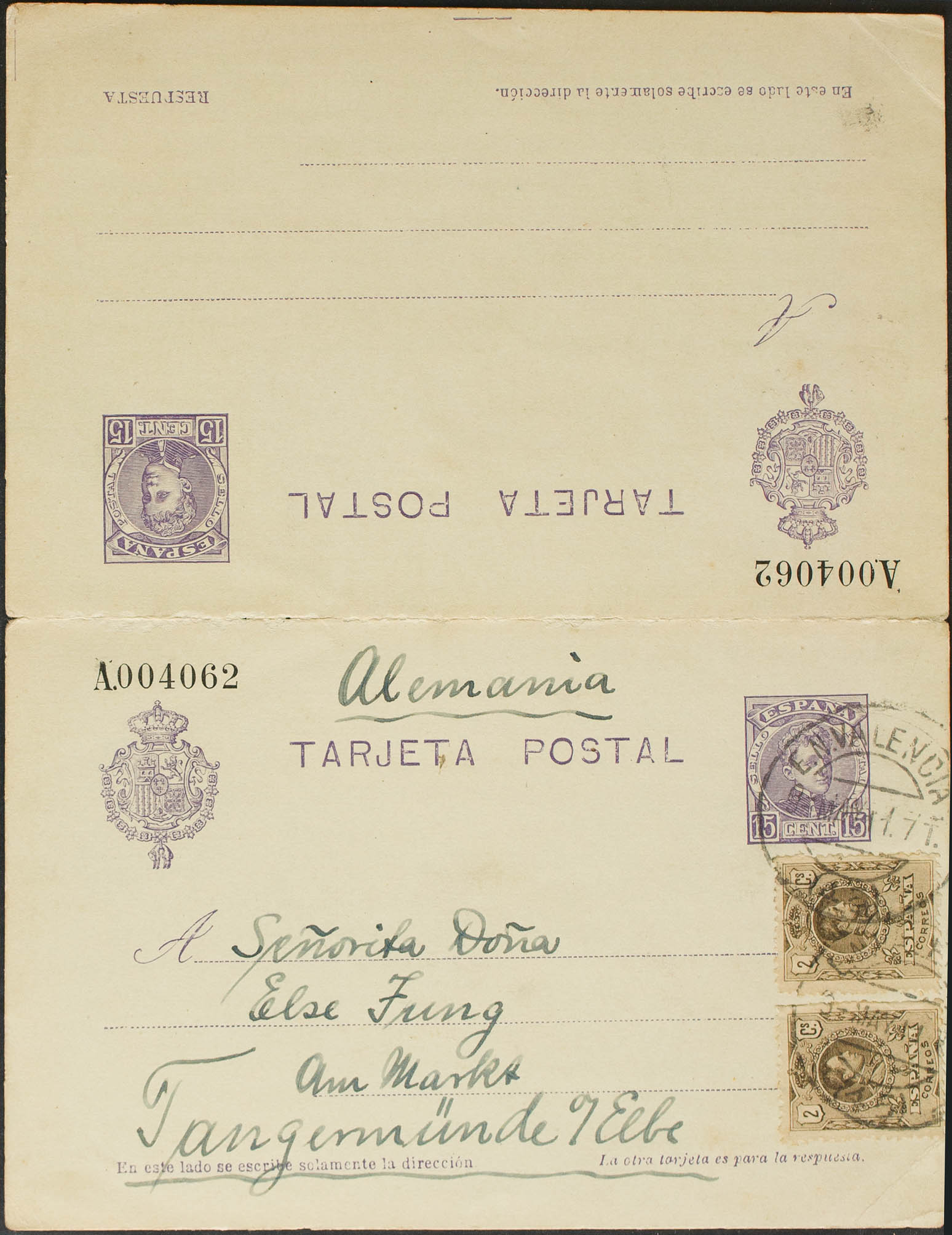 EP46. 1911. 15 cts + 15 cts violet on Entire Card Round-trip postcard circulated only outward from VALENCIA to TANGERMUNDE (GERMANY) and with complementary postage of two 2-ct brown stamps. MAGNIFICENT.