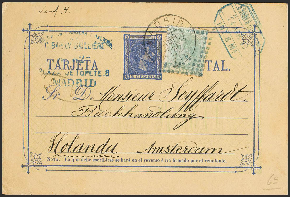 EP8, 201. 1880. 5 cts overseas on Stationery Card from MADRID to AMSTERDAM (HOLLAND), with complementary postage of 5 green cts. On the front it marks CORREO GENERAL / INT. 8 Mª, in blue and on the back arrival. MAGNIFICENT AND UNUSUAL DESTINATION.