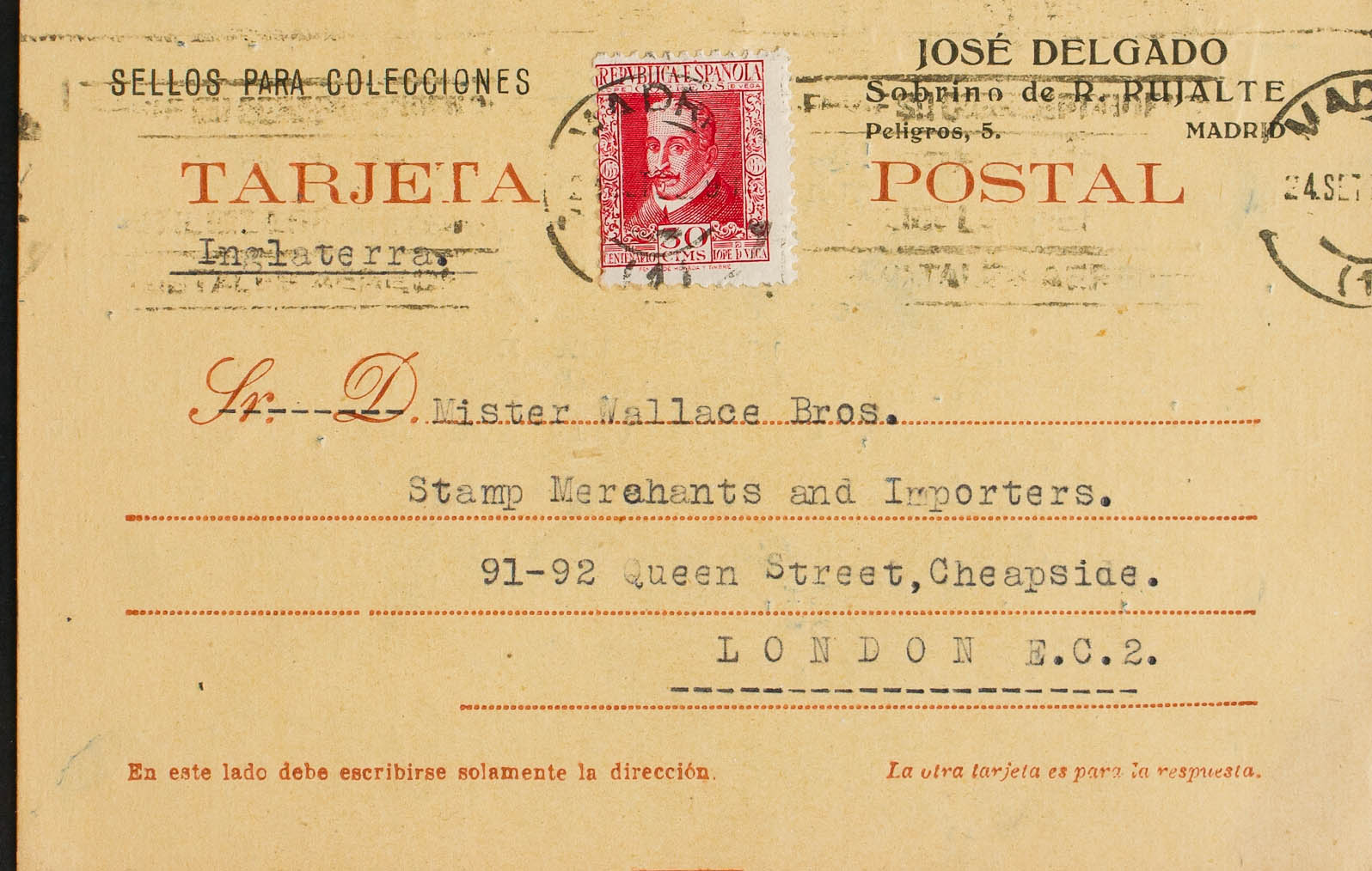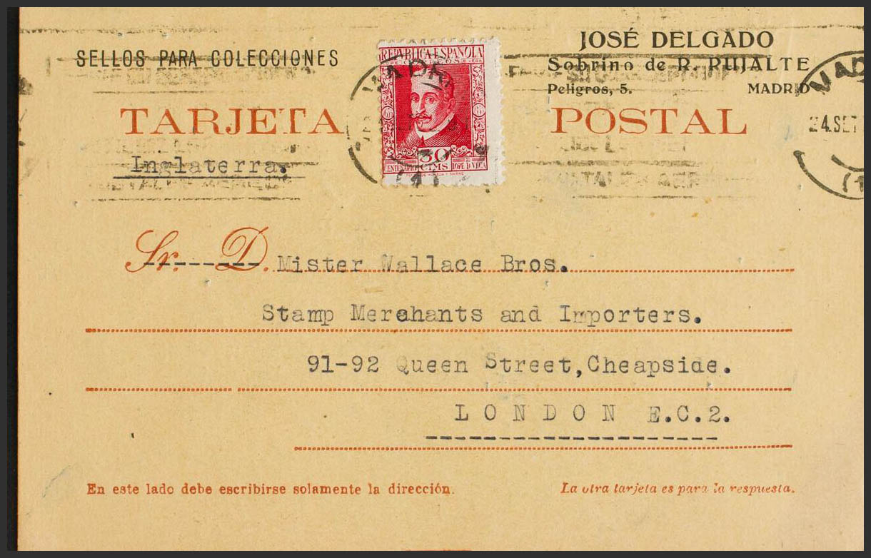 691. 1935. 30 cts red. Postal Stationery Card (probably from Cuba) from MADRID to LONDON (ENGLAND), used as a Postal Card by a philatelic merchant. MAGNIFICENT.