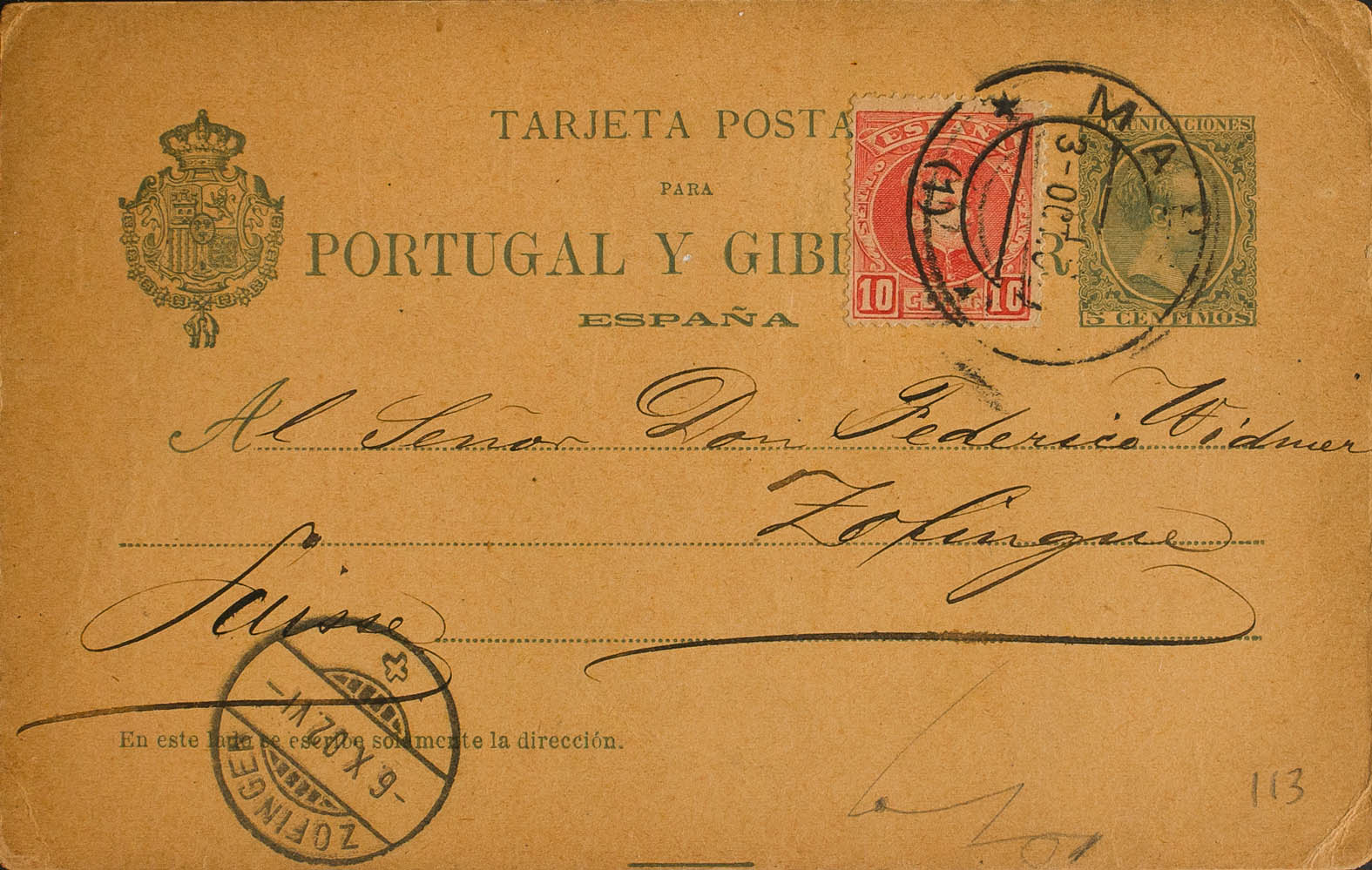EP34, 243. 1902. 5 cts green on Entire Post Card from MADRID to ZOFINGEN (SWITZERLAND), with complementary postage of 10 cts red from the Cadet issue. On the arrival front. MAGNIFICENT AND RARE COMBINATION OF POSTAGE OF DIFFERENT EMISSIONS. (Láiz 2006: 34Fo, 300 Euros)