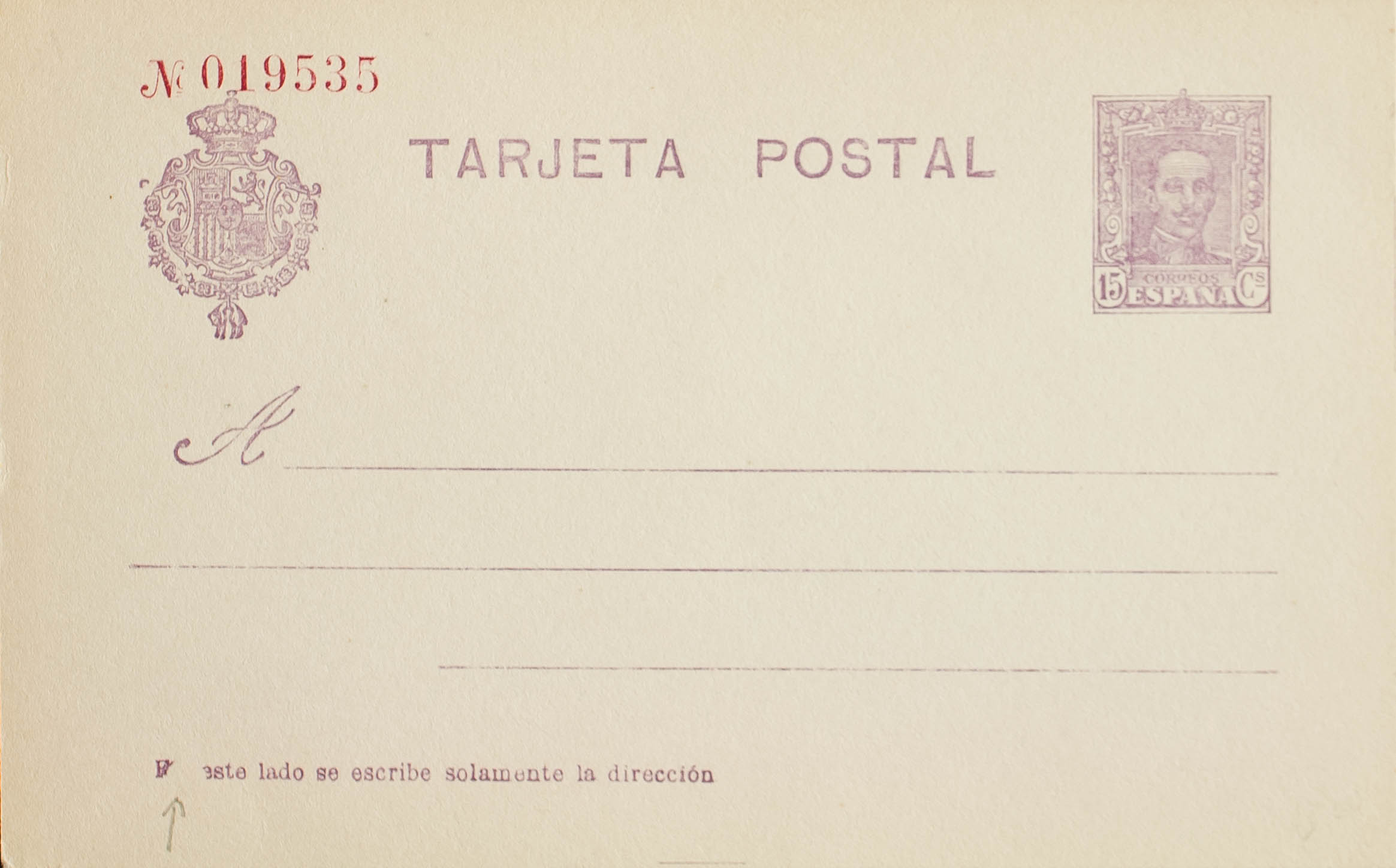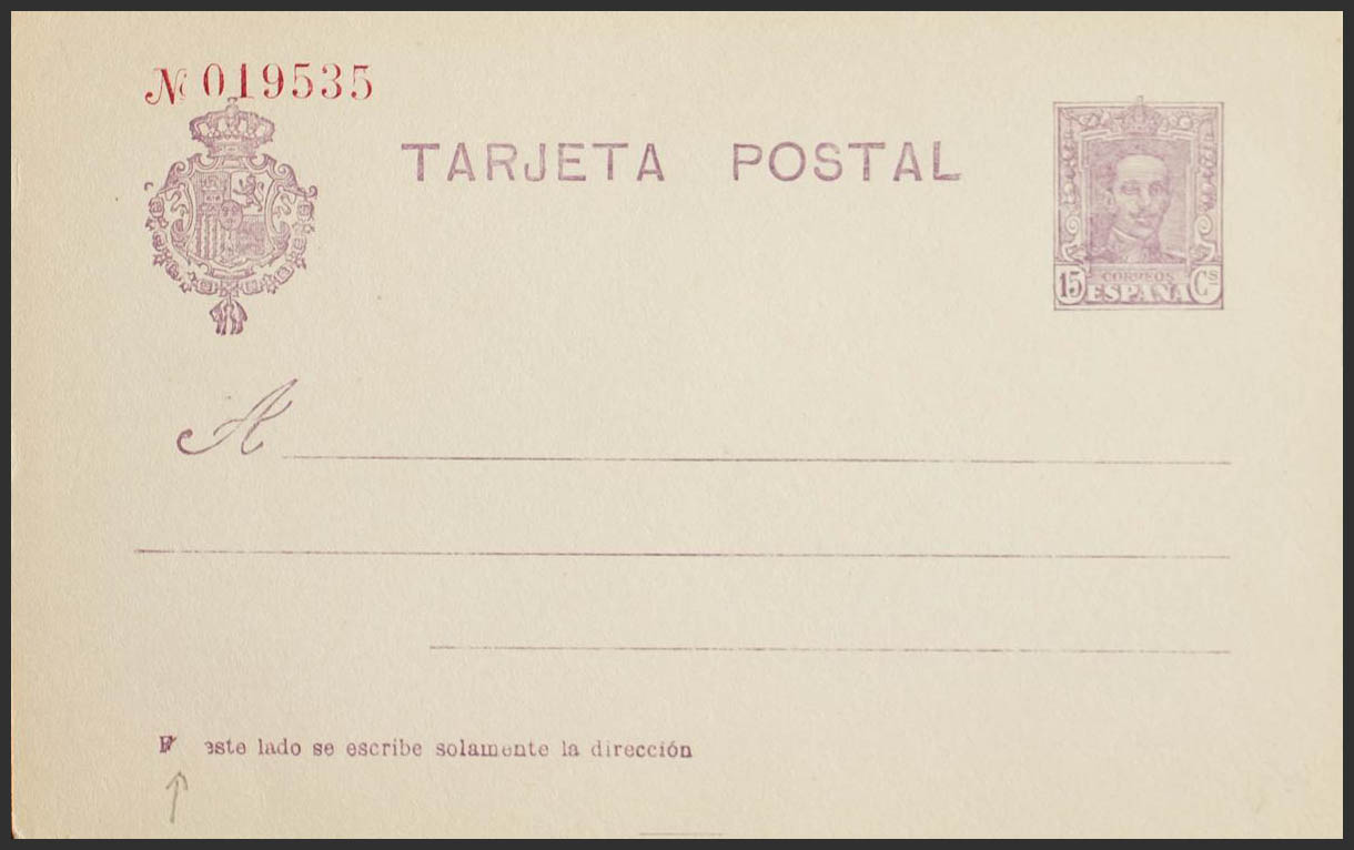 English (★) EP57NR. 1925. 15 cts violet envelope Postal Entire Card. NUMBERING IN RED. MAGNIFICENT AND VERY RARE. Edifil 2011: 350 Euros