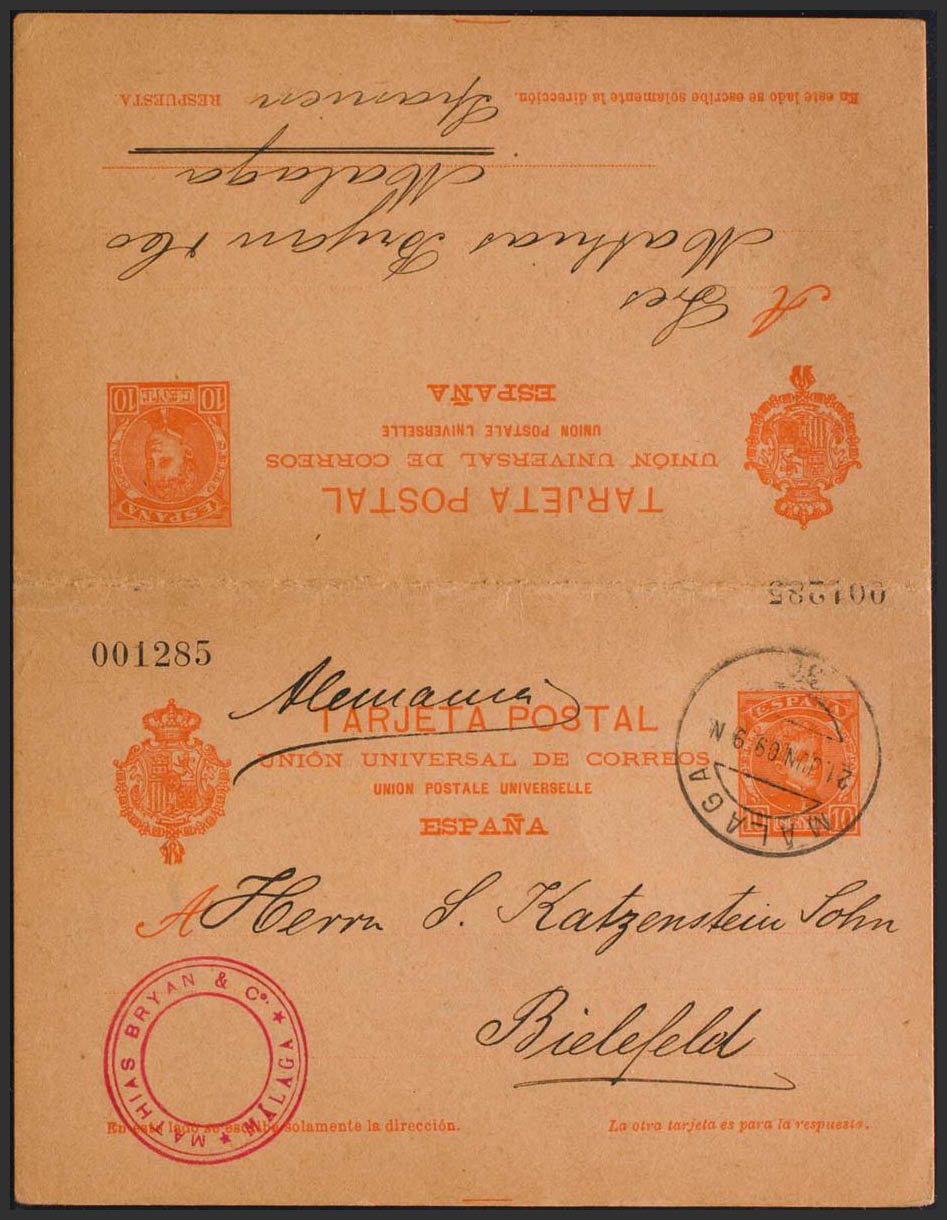 EP41. 1909. 10 cts + 10 cts orange on Entire Round-trip Postal Card, the one-way ticket circulated from MALAGA to BIELEFELD (GERMANY). MAGNIFICENT.