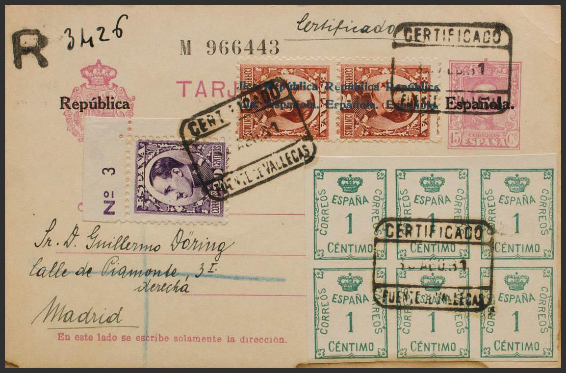 EP61, 593(2), 291(6), 494. 1931. 15 cts lilac pink on Entire Mail Card Certified Postal Internal Mail of MADRID, with additional postage of 2 cts, two stamps, 1 cts, block of six and 20 cts. CERTIFIED postmark / PUENTE DE VALLECAS. MAGNIFICENT AND RARE POSTAGE.