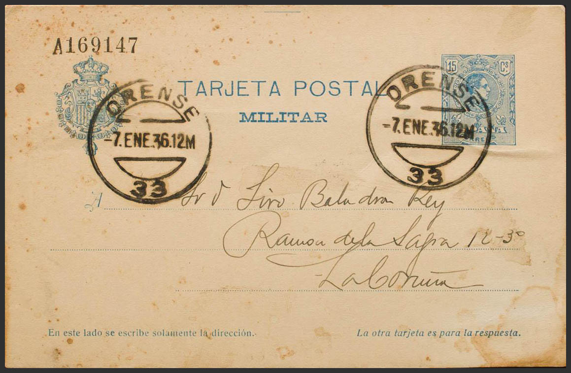 EPM1i. 1936. 15 cts blue envelope Military Post Card (one way) from ORENSE to LA CORUÑA. PRETTY.