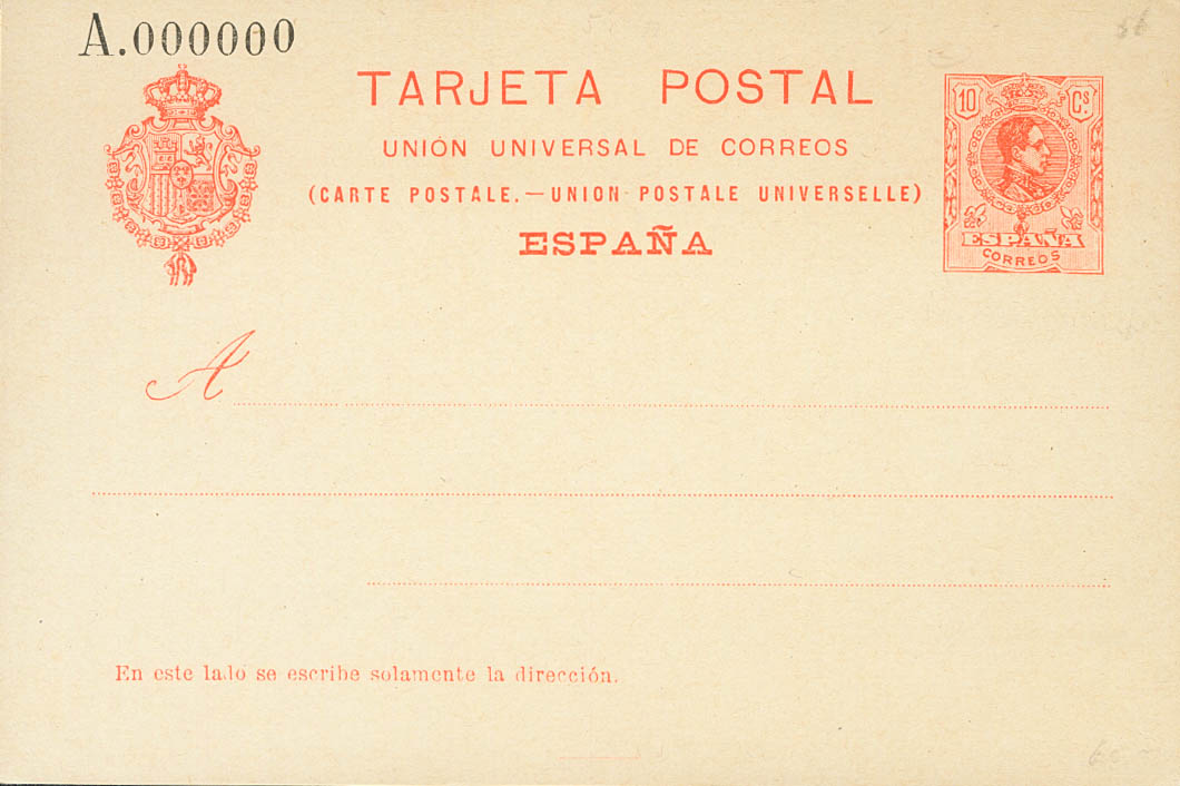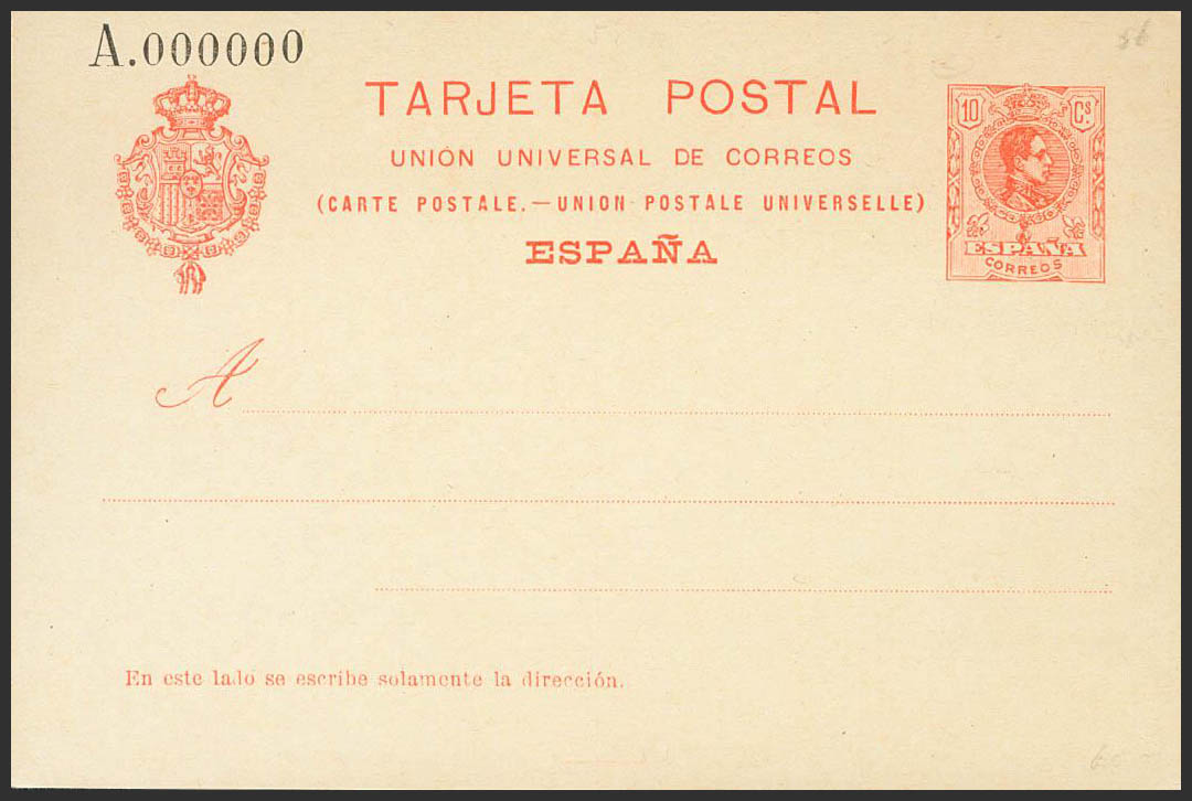 (★) EP53N, EP54N. 1910. 10 cts orange on Postal Stationery Card and 10 cts+10 cts orange on Postal Stationery Card, back and forth, both with NºA000000. MAGNIFICENT. Edifil 2017: 245 Euros