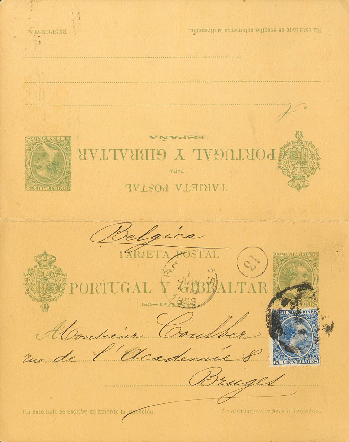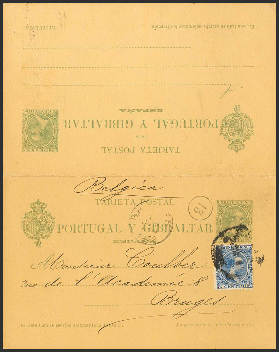 EP35. 1898. 5 cts+5 cts green on Entire Postal Card circulated only from MALAGA to BRUGES (BELGIUM), with complementary postage of 5 cts blue. On the arrival front. MAGNIFICENT.
