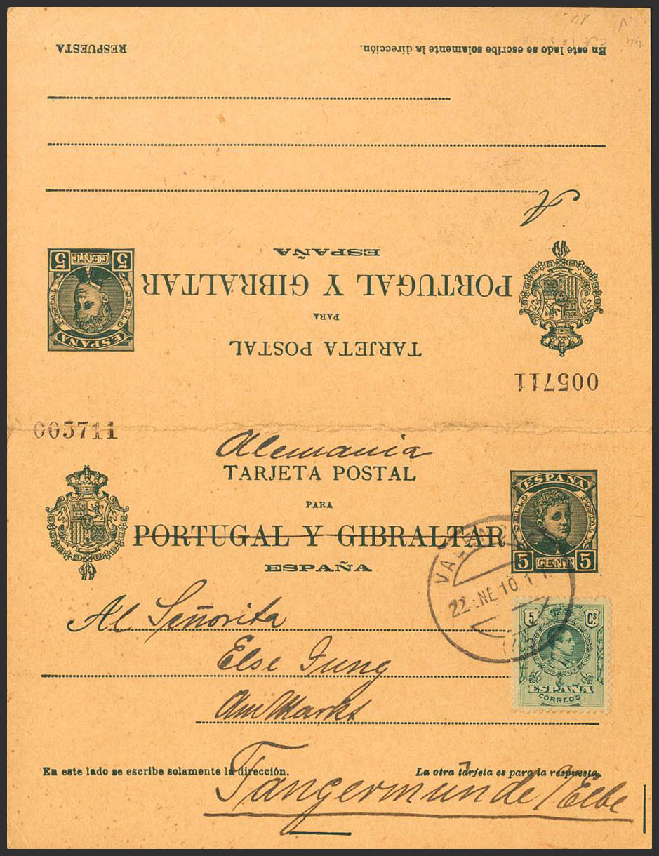 English EP44. 1910. 5 cts+5 cts green blue on Entire Postal Card circulated only the way from VALENCIA to TANGERMUNDE (GERMANY), with complementary postage of 5 green cts. MAGNIFICENT. Edifil 2019: 143 Euros