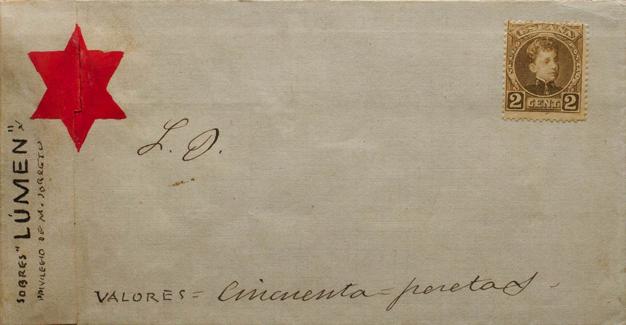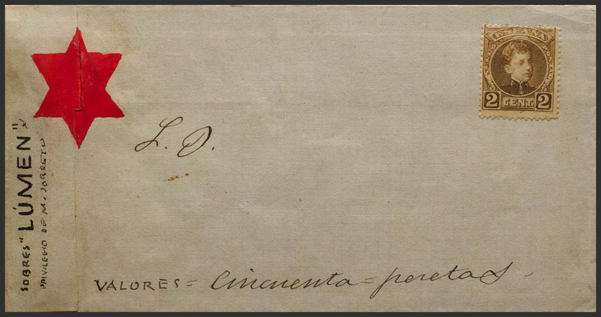 241. (1902ca). 2 cts brown attached to a handmade envelope (resembling a Postal Stationery) with a red star and handwritten annotations "Envelopes LUMEN Privilegio de M. Jurreto" and "Values fifty pesetas". MAGNIFICENT AND VERY RARE.