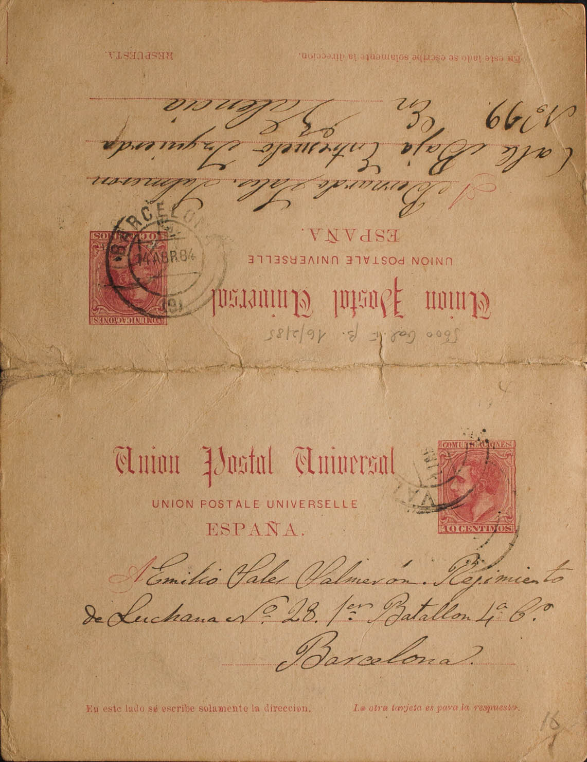 EP17. 1884. 10 cts + 10 cts carmine on Entire Post Card circulated from VALENCIA to BARCELONA and return from BARCELONA to VALENCIA. BEAUTIFUL AND VERY RARE. Edifil 2018: 375 Euros