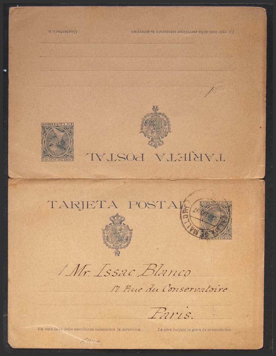 EP28. 1897. 15 cts + 15 cts blue on Entire Card Postal circulated only the one way circulated from PALMA DE MALLORCA to PARIS, round trip. MAGNIFICENT.
