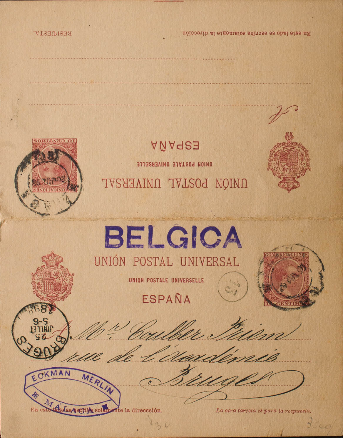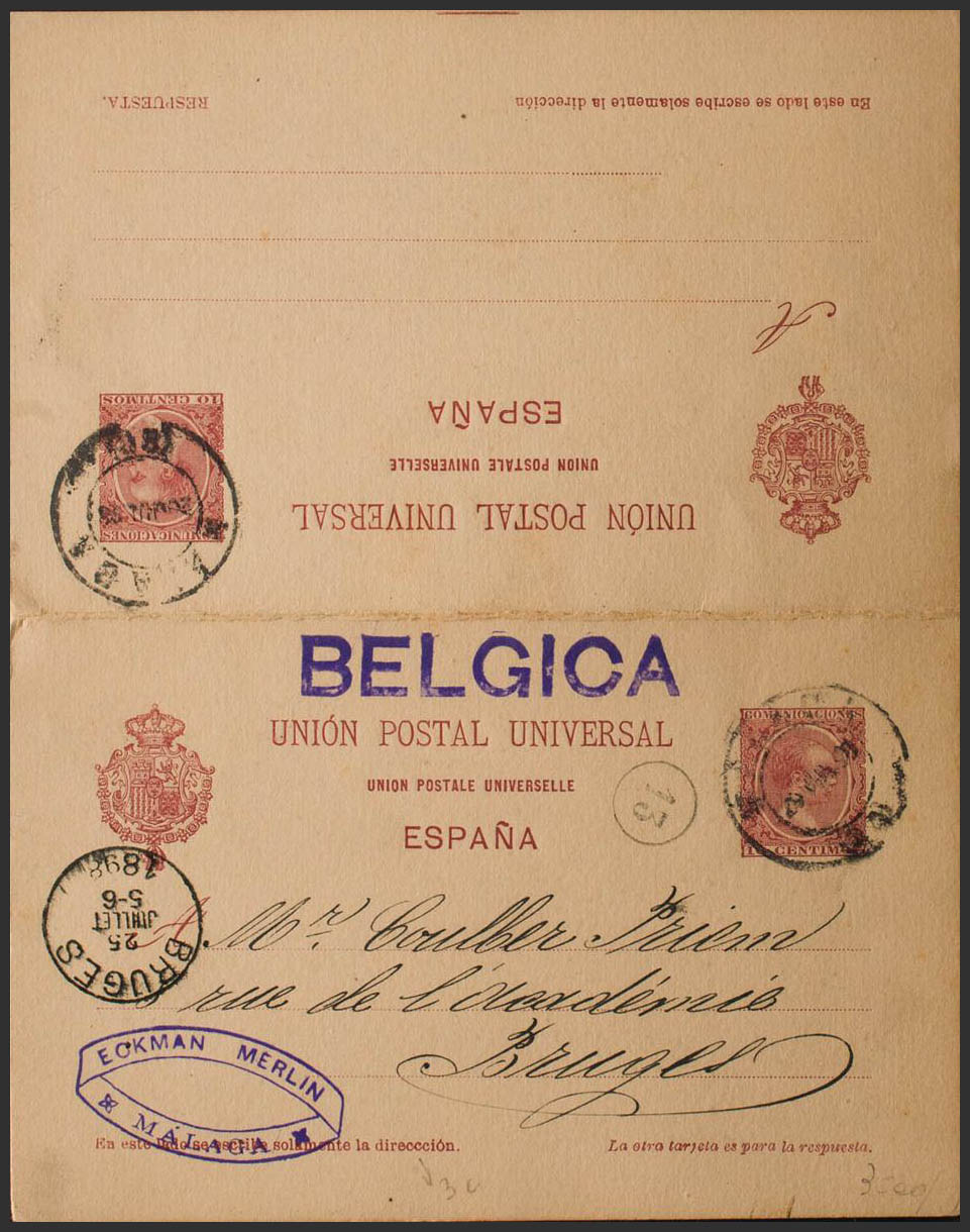 EP33. 1898. 10 cts + 10 cts carmine on Entire Postal Card circulated only outbound from MALAGA to BRUGES (BELGIUM), roundtrip. On the arrival front. MAGNIFICENT. Edifil 2018: -120 Euros