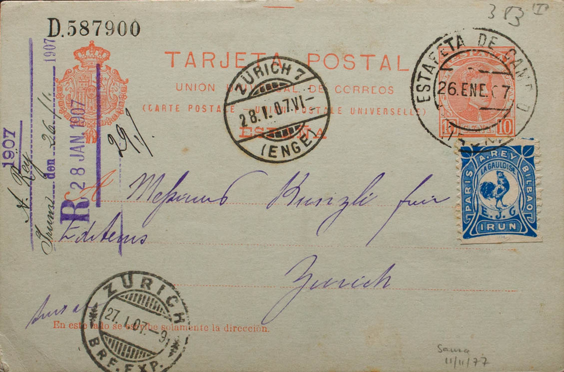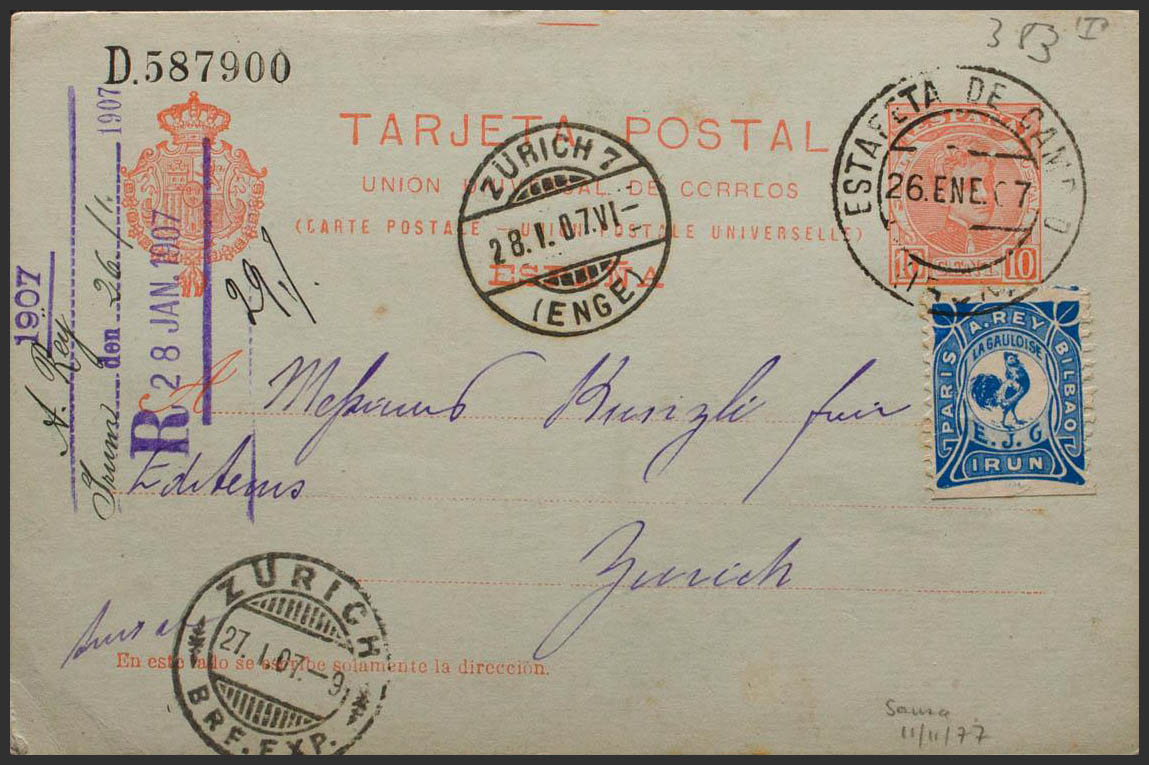 EP47. 1907. 10 cts red envelope Post Card from IRUN to ZURICH (SWITZERLAND), with private vignette PARIS TO REY BILBAO / IRUN, in blue. On the arrival front. MAGNIFICENT AND VERY RARE.