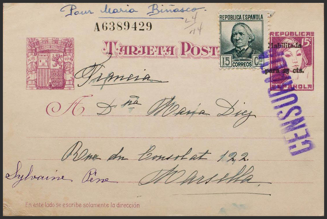 EP76, 683. 1937. 25 cts on 15 cts lilac on Entire Post Card from MADRID to MARSEILLE (FRANCE), with complementary postage of 15 cts gray green. Postmark CENSURED, in violet. MAGNIFICENT.